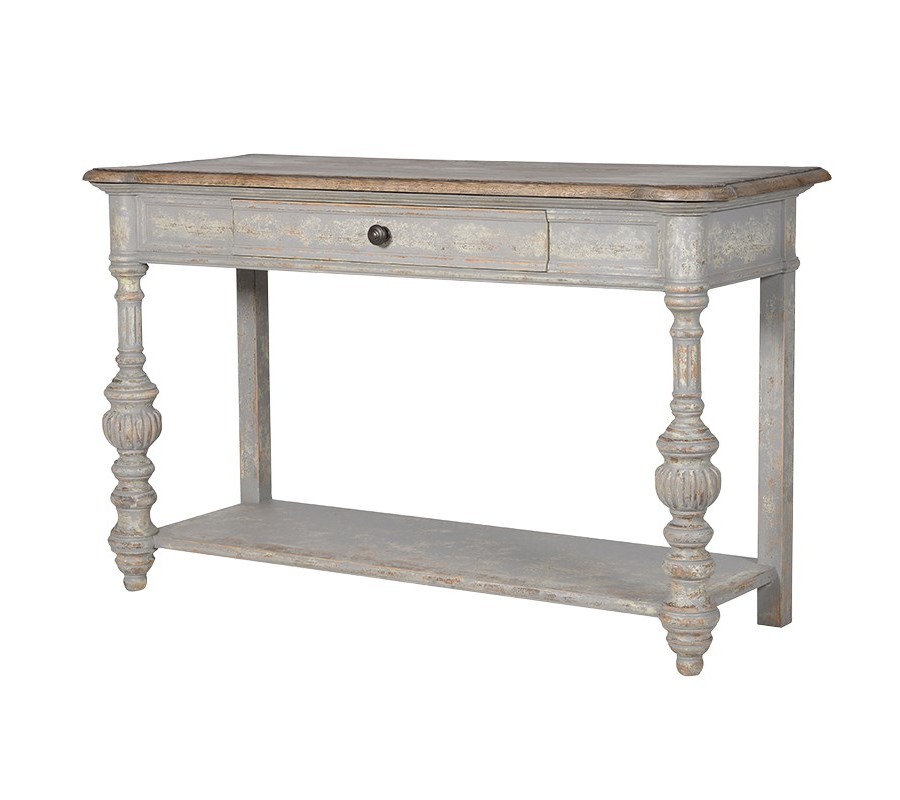 Dlhý konzolový stolík Frezala je výbornou voľbou pri zariaďovaní užších predsiení a hál, skvele vynikne aj priestoroch obývacích miestností, jedální či spálni, kde sa dá využiť ako toaletný stolík. Bohato dekorovaná konštrukcia je doplnená vrchnou odkladacou doskou v odlišnom odtieni, čím na stolíku vzniká jemný farebný kontrast. Celý stolík je vyrobený z borovicového a dubového dreva, ktorého ošúchaná povrchová úprava ho zaraďuje k prvkom obľúbeného vidieckeho či vintage štýlu. Okrem otvorenej odkladacej plochy na spodnej časti je konzolový stolík doplnený aj väčšou zásuvkou v strede hornej časti. Štýlovú vintage konzolu môžete kombinovať s masívnym dreveným nábytkom v podobnom štýle, skvele vynikne v kombinácii s mäkkými povrchmi v podobe vzorovaných kobercov, hrubých závesov či dekoratívnych vankúšov.