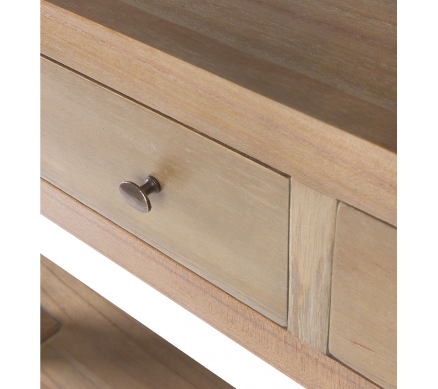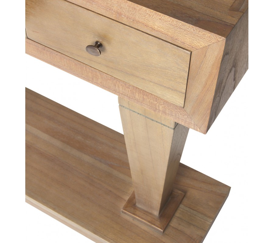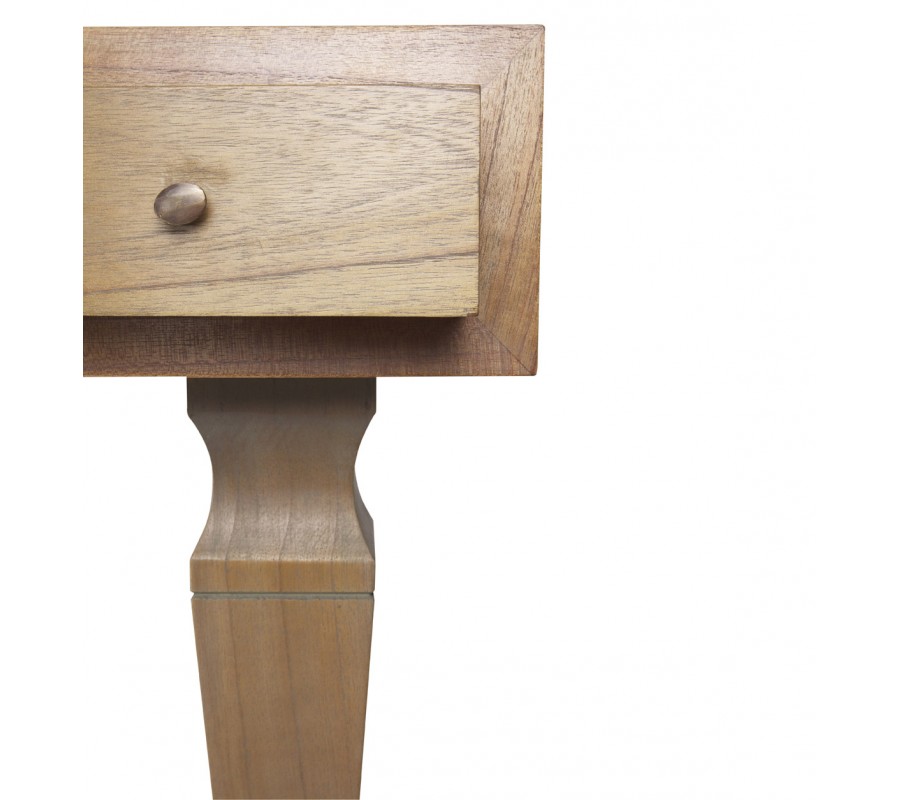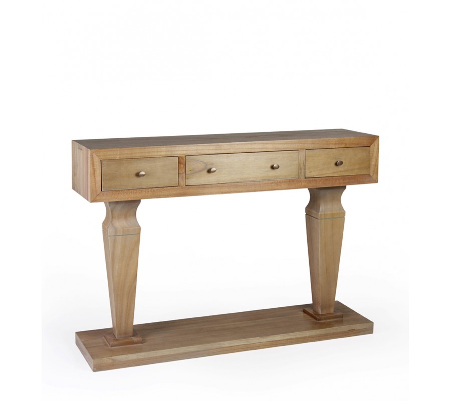 Dizajnová konzola z kolekcie masívneho nábytku Madera Vás na prvý pohľad očarí svojim moderným vzhľadom s nádychom koloniálneho štýlu. Masívny nábytok nastupuje čoraz rýchlejšie do popredia v rámci trendov v interiérovom dizajne. Nesúc sa v nestarnúcom duchu a poskytujúc dostatok úložného priestoru v podobe troch zásuviek Vás zaručene poteší svojou štýlovosťou, ktorú jej prepožičiavajú najmä vkusné zlaté prvky. Či už sa jedná o distingvované rukoväte na zásuvkách alebo stĺpovité nožičky, tieto detaily Vás zaručene potešia.