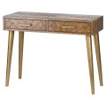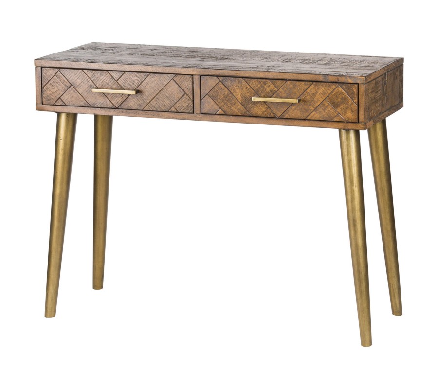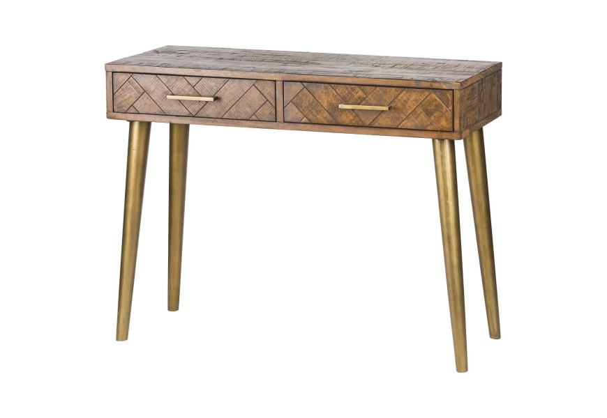 Retro medovo-hnedý konzolový stolík HAVANA ORO s parketovým vzorom na nožičkách zlatej farby 100cm