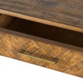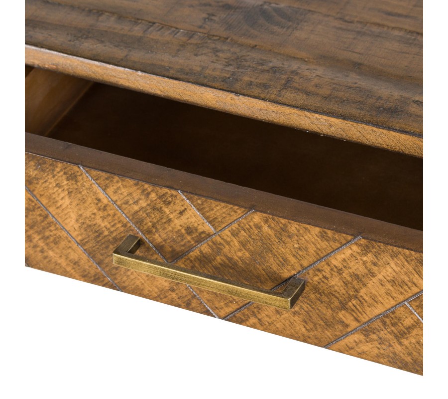 Dizajnový konzolový stolík z kolekcie Havana Oro, ktorú ľahko spoznáte vďaka charakteristickej kombinácii detailov v antickej zlatej a parketového vzoru Vás už na prvý pohľad zaujme svojím sofistikovaným zjavom. Konzola disponuje dvomi zásuvkami, ktoré zabezpečujú dostatok úložného priestoru. Masívne drevo v medovo-hnedej farbe s retro patinou, ktoré si vďaka precíznej ručnej práci zachovalo unikátnu štruktúru letokruhov v kombinácii s parketovým vzorom čiel zásuviek zaručene vnesie do Vašej domácnosti svieži retro nádych. Vysoké drevené nožičky spolu s úchytkami zásuviek v antickej zlatej dodávajú konzolovému stolíku jemný art-deco nádych, vďaka čomu sa stolík nestratí ani v luxusnejšie zariadených art-deco interiéroch. Konzolový stolík sa bude vynikajúco vynímať v kombinácii s ďalším nábytkom z našej kolekcie Havana Oro.