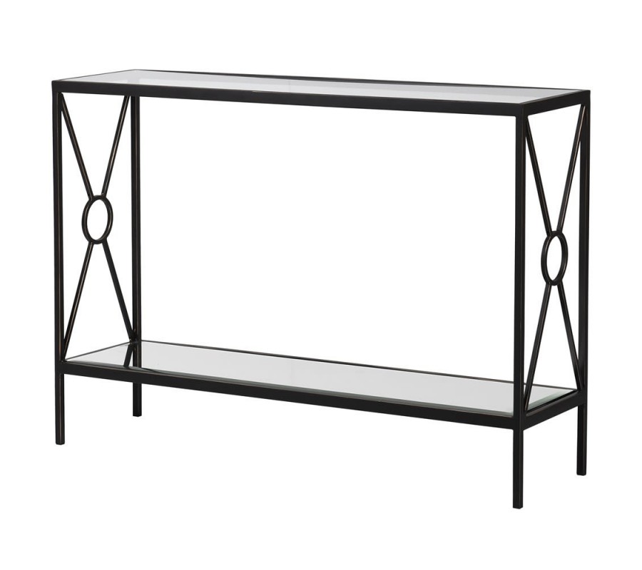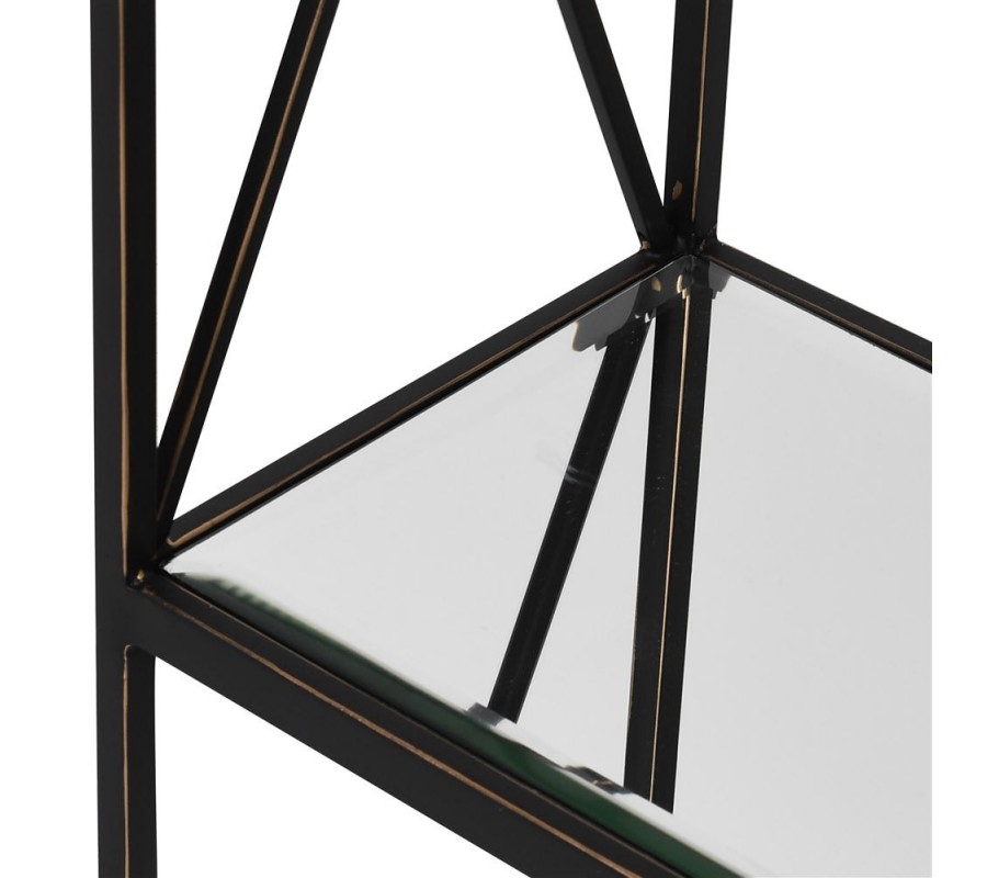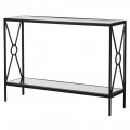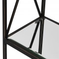 Konzolový stolík s jemným dizajnom zaujme už pri prvom pohľade. Vďaka kovovej konštrukcie, ktorá má klasický obdĺžnikovitý tvar so zrkadlovými sklenenými doskami sa vytvára elegantný nadčasový dizajn. Povrchová úprava kovovej konštrukčnej časti konzoly je tmavohnedá s medenou patinou, farba vyniká hlavne pri hranách konštrukcie, ktorá je obohatená z bočných strán o geometrické vzory. Konzolový stolík pôsobí vzdušne kvôli jemným líniám nôh, priestory jednoznačne rozžiari a dodá im pocit luxusu. Konzola je taktiež obohatená odkladacím priestorom v spodnej časti. Je vhodná predovšetkým do predsiene, chodby, obývačky, keďže jej využitie je naozaj všestranné. Konzolový stolík odporúčame umiestňovať hlavne do moderne zariadených interiérov, alebo do interiérov s nábytkami a bytovými doplnkami v Art-deco štýle.
