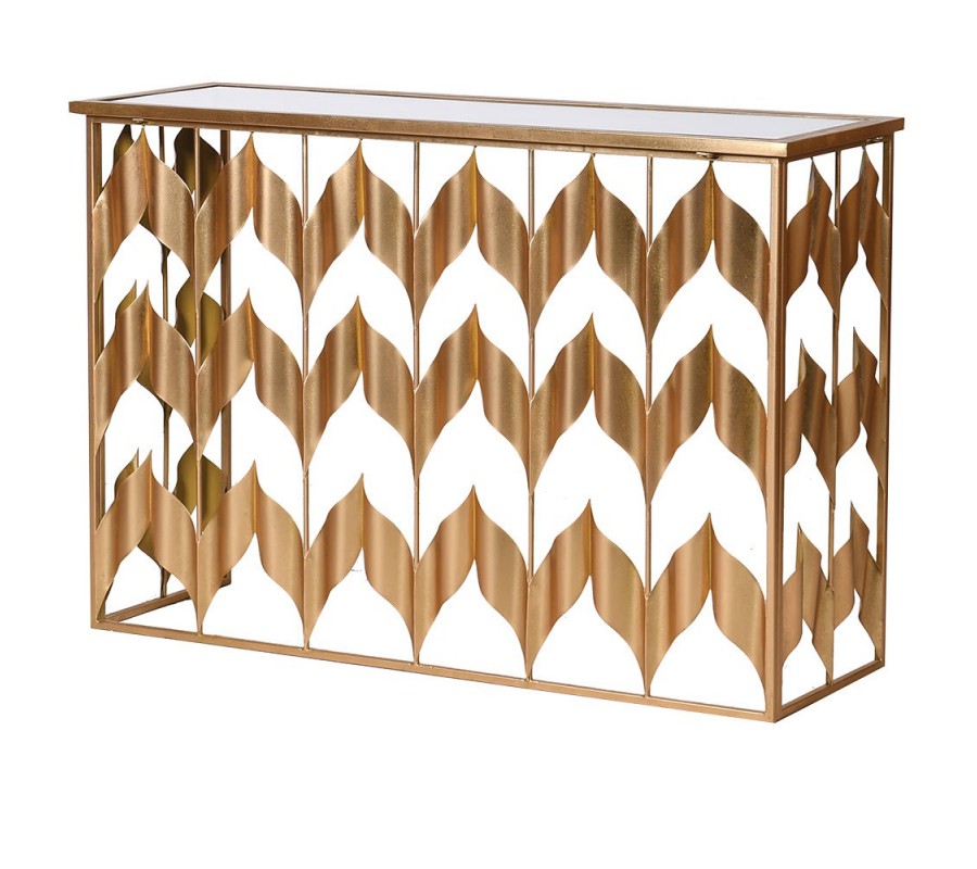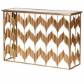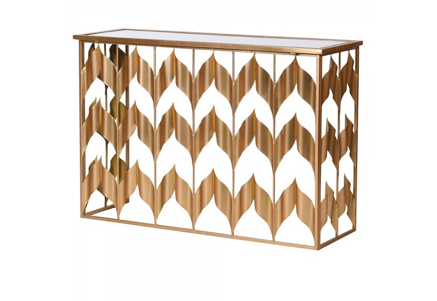 Art-deco luxusná konzola Eloisse z kovu v zlatej farbe s ornamentálnym zdobením a zrkadlovou sklenenou doskou 120 cm