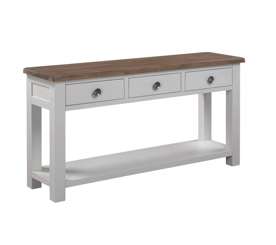 Exkluzívna konzola z našej kolekcie Escapia predstavuje elegantný súlad nadčasového dizajnu a nestarnúcej klasiky. Konzola prepája jemné neutrálne farby s čistými líniami a praktickým dizajnom vhodným do každého interiéru. Je vyrobená z masívneho dreva v štýlovom off-white prevedení. Povrchová doska sa nesie v prírodnej hnedej farbe a necháva vyniknúť prirodzenú štruktúru dreva. Konzola disponuje poličkou v spodnej časti a tromi zásuvkami v časti hornej, ktoré zdobia dizajnové okrúhle rukoväte. Vďaka svojej univerzálnej farebnosti je dokonalým kúskom na kombinovanie s neutrálnymi i výraznejšími kontrastnými farbami. Pre vytvorenie dokonalého provensálskeho vzhľadu odporúčame kombináciu s ďalšími kúskami z našej kolekcie Escapia a doplnkami v jemných pastelových farbách s florálnym vzorom.