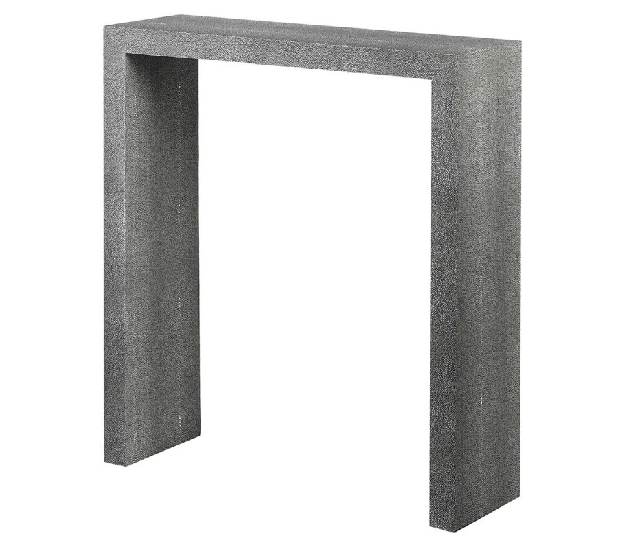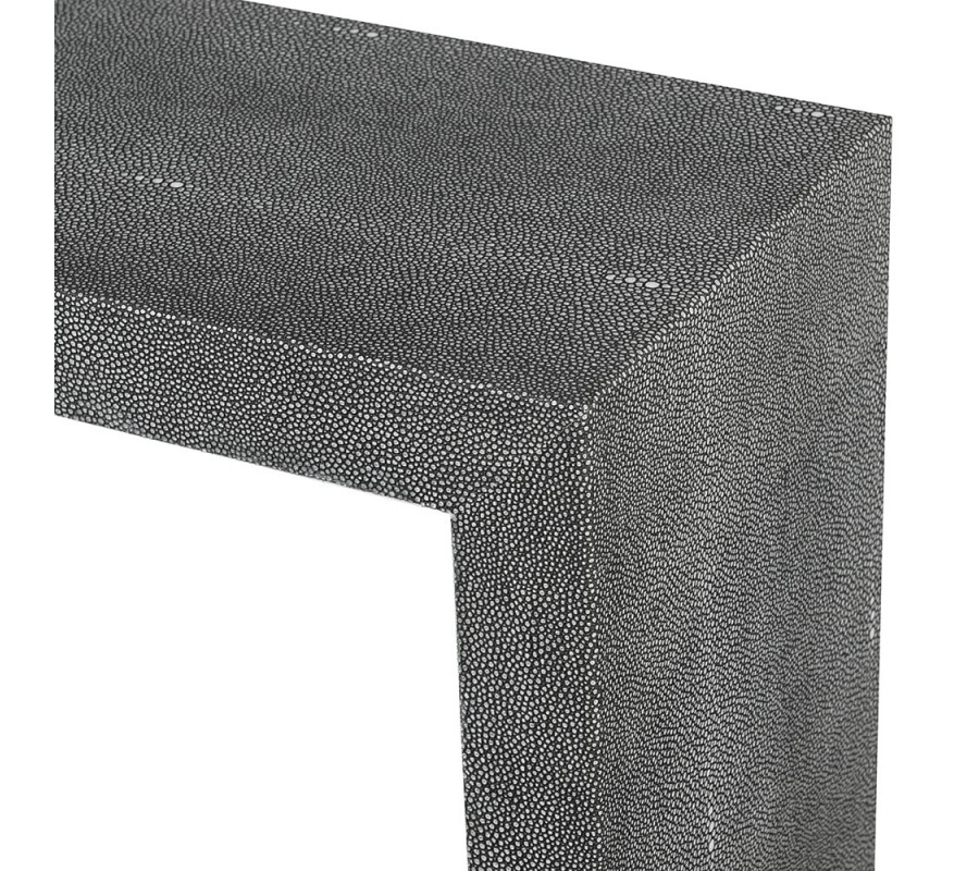 Moderný konzolový stolík Shagreen so svojim minimalistckým tvarom a jedinečným povrchom zaujme každého už na prvý pohľad. Vyniká vďaka povrchu, ktorý je vyrobený z pravej šagrénovej kože, ktorého poznávacím prvkom je bodkovaná štruktúra kože (https://en.wikipedia.org/wiki/Shagreen). Jednoduchý geometrický tvar stolíka je vyrobený z materiálu MDF. Vďaka svojmu tvaru a povrchovej úprave je nesmrteľným a nadčasovým kúskom, ktorý sa hodí do moderne zariadených predsiení, hál, hotelov, či obývacích izieb. Vďaka svojej neutrálnej farbe sa hodí do miestností, kde prevládajú sýte farby, ako napríklad žltá, kráľovská modrá či smaragdovo zelená. Konzolový stolík sa taktiež hodí aj do neutrálne ladených miestností, kde sú použité svetlé farby v studených odtieňoch, ako papierová biela, kamenná sivá, či dymová sivá. Miestnosť v ktorej sa konzola nachádza odporúčame doplniť nábytkami s minimalistickým dizajnom. Nad konzolový stolík môžete taktiež umiestniť jednoduché a štýlové zrkadlo, ktoré rozžiari a presvetlí priestor.