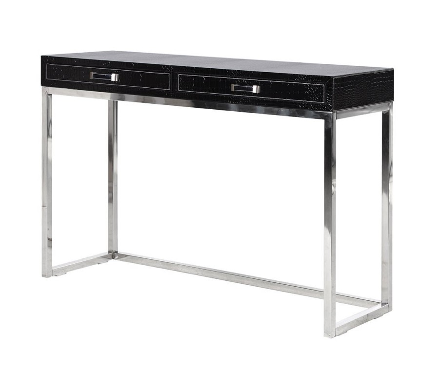 Konzolový stolík v Art-deco štýle zaujme každého už na prvý pohľad svojim minimalistickým tvarom a extravagantnými materiálmi. Konzola v tvare obdĺžnika sa skladá z konštrukčnej časti, z nehrdzavejúcej ocele v lesklej chrómovej farbe. Konštrukcia je doplnená o telo, ktoré je pokryté lesklou čiernou reliéfnou krokodílou ekokožou, ktoré mu dodáva jedinečný vzhľad a čaro. Stolík tiež disponuje dvomi praktickými zásuvkami na uschovanie drobnejších predmetov. Zásuvky sú po okrajoch doplnené tenkými a elegantnými líniami, ktoré majú ozdobnú funkciu. Konzolový stolík odporúčame umiestniť do predsiene, ktorý je zariadený v Art-deco, alebo modernom štýle.