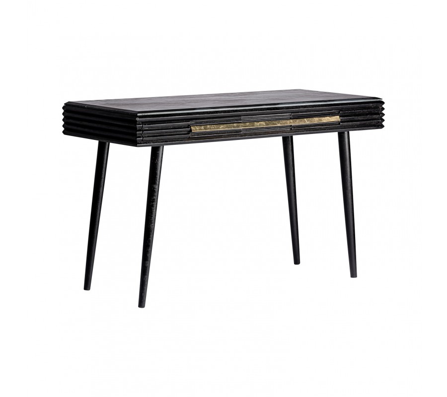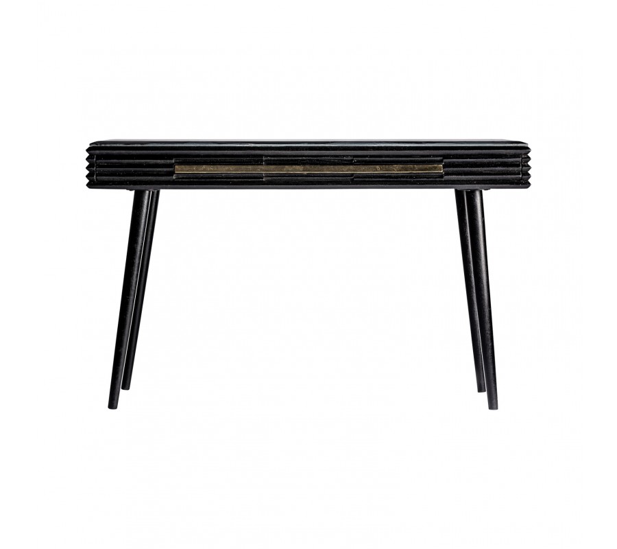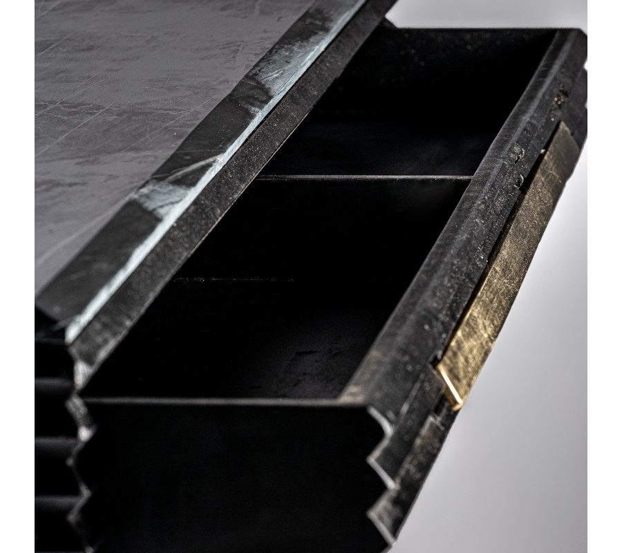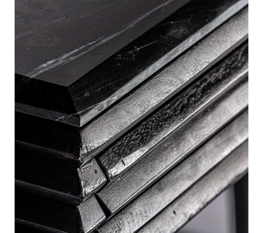 Konzolový stolík z kolekcie Plissé Nero vás uchváti svojím luxusným a kvalitným prevedením, ktoré zaručene obohatí váš interiér. Konzolový stolík je ručne vyrobený používaním prirodzených procesov a materiálov. Stolík a jeho nožičky sú vyrábané z kvalitného mangového masívu v čiernej farbe s povrchovou úpravou vo vintage štýle. Masívny stolík je obohatený o krásnu mramorovú vrchnú dosku, vďaka čomu vytvorí konzola Plissé Nero exkluzívny, luxusne pôsobiaci a ľahko kombinovateľný dizajn. Konzolový stolík taktiež disponuje zásuvkou v strede stolíka, ktorá ponúka aj praktický úložný priestor. Cez vonkajší obvod stolíka sa ťahá päť horizontálnych línií, ktoré osviežia dizajn, rovnako ako aj zlatá kovová rukoväť na zásuvke, ktorá podčiarkne art-deco štýlový vzhľad stolíka. Vďaka svojím dizajnovým prvkom odporúčame kombinovať konzolový stolík Plissé Nero v tmavých interiéroch s výraznými farbami a s čiernym art-deco nábytkom so zlatými prvkami a zlatými kovovými dekoráciami, ktoré vyniknú s kovovou rukoväťou.