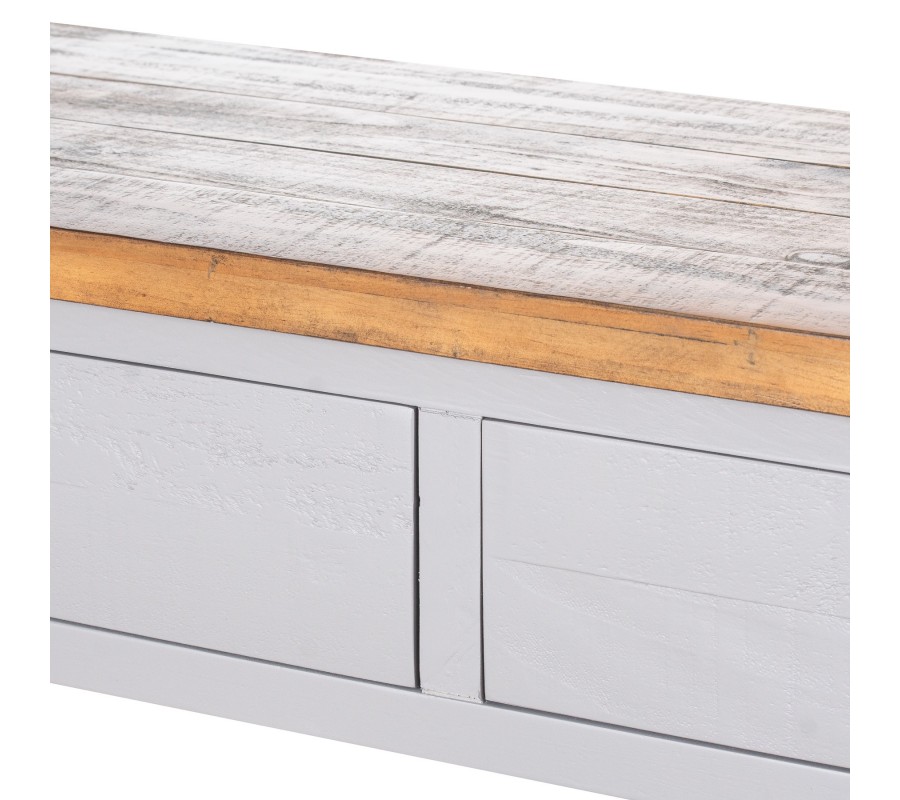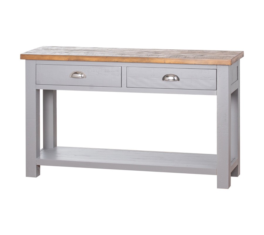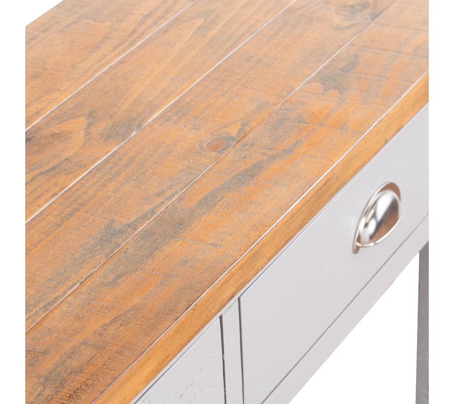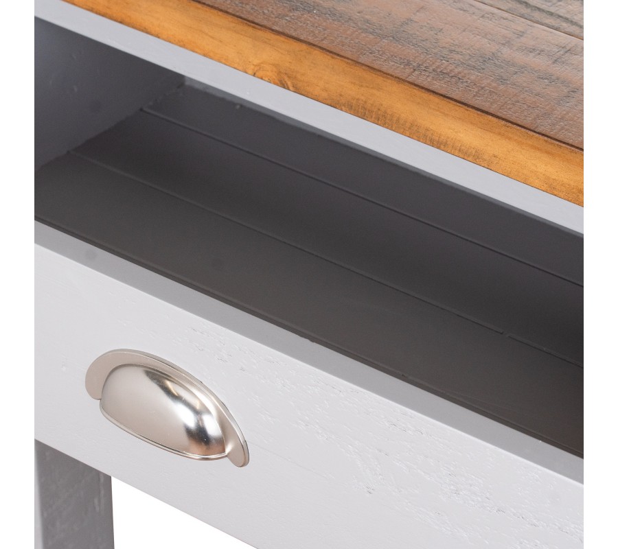Dizajnová konzola z našej jedinečnej kolekcie BYLAND Vás jednoznačne svojím autentickým vzhľadom. Konzolový stolík je vyrobený z kvalitného masívneho dreva, ktoré bolo ručnou prácou pretvorené do tohto jedinečného kúsku. Stolík sa skladá z dvoch priestranných zásuviek, zabezpečujúc tak dostatok úložného priestoru, nachádzajúcich sa pod vrchnou doskou, ktorá si vďaka špeciálnej povrchovej úprave zachovala svoju jedinečnú prírodnú štruktúru a taktiež z priestrannej poličky nachádzajúcej sa v spodnej časti konzoly. Celkový dizajn stolíka je doplnený kovovými úchytkami striebornej farby umiestnenými uprostred čiel zásuviek. Konzola sa bude zaručene vynikajúco vynímať vo Vašej predsieni v kombinácii s nástenným zrkadlom a dekoráciami v striebornej farbe.
