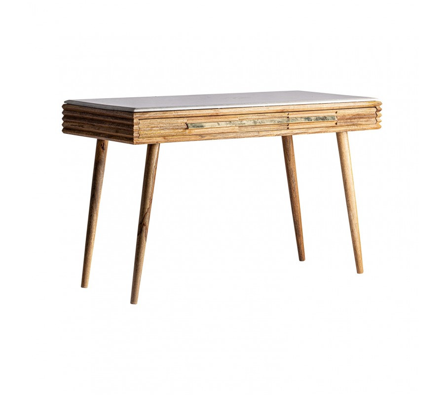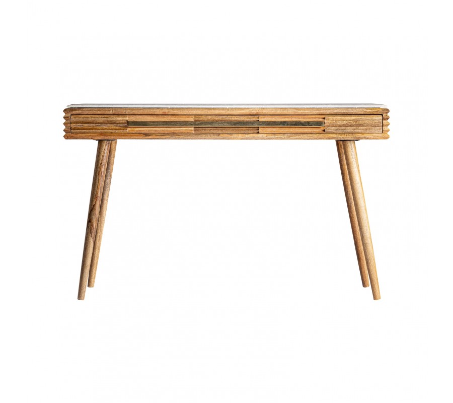 Exkluzívny mramorový konzolový stolík Plissé Nature z naturálne hnedého masívneho dreva so zásuvkou a zlatou rukoväťou 144cm