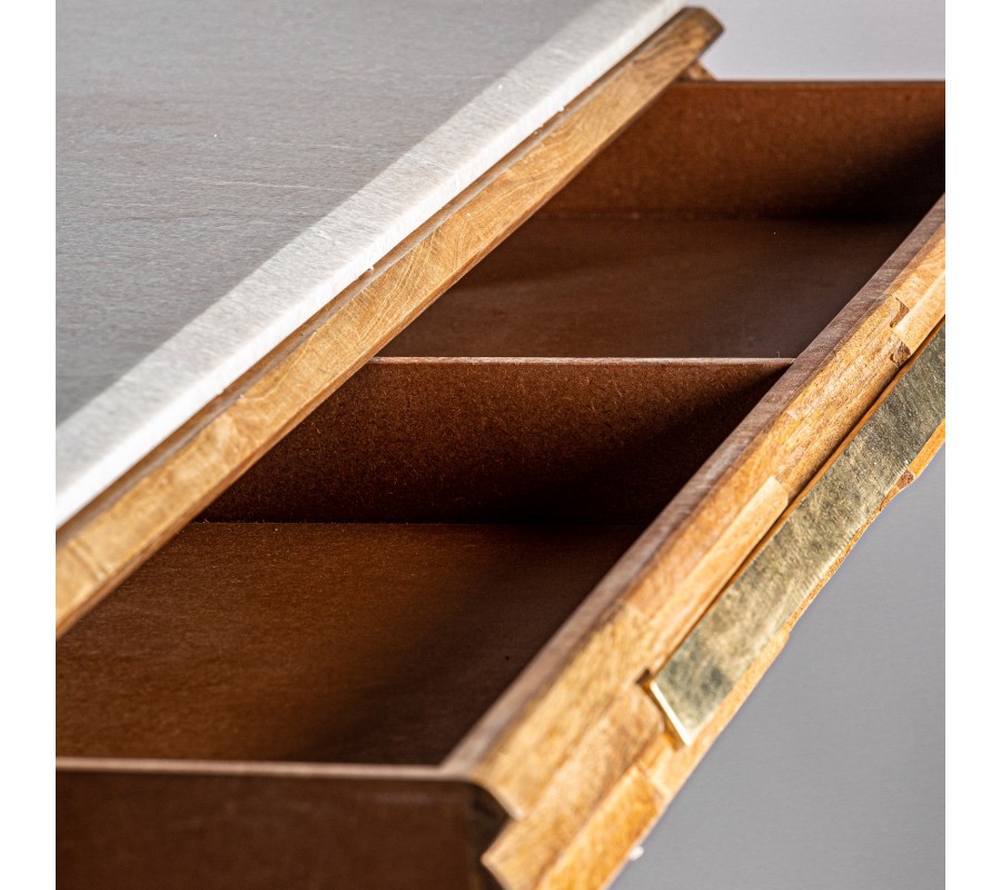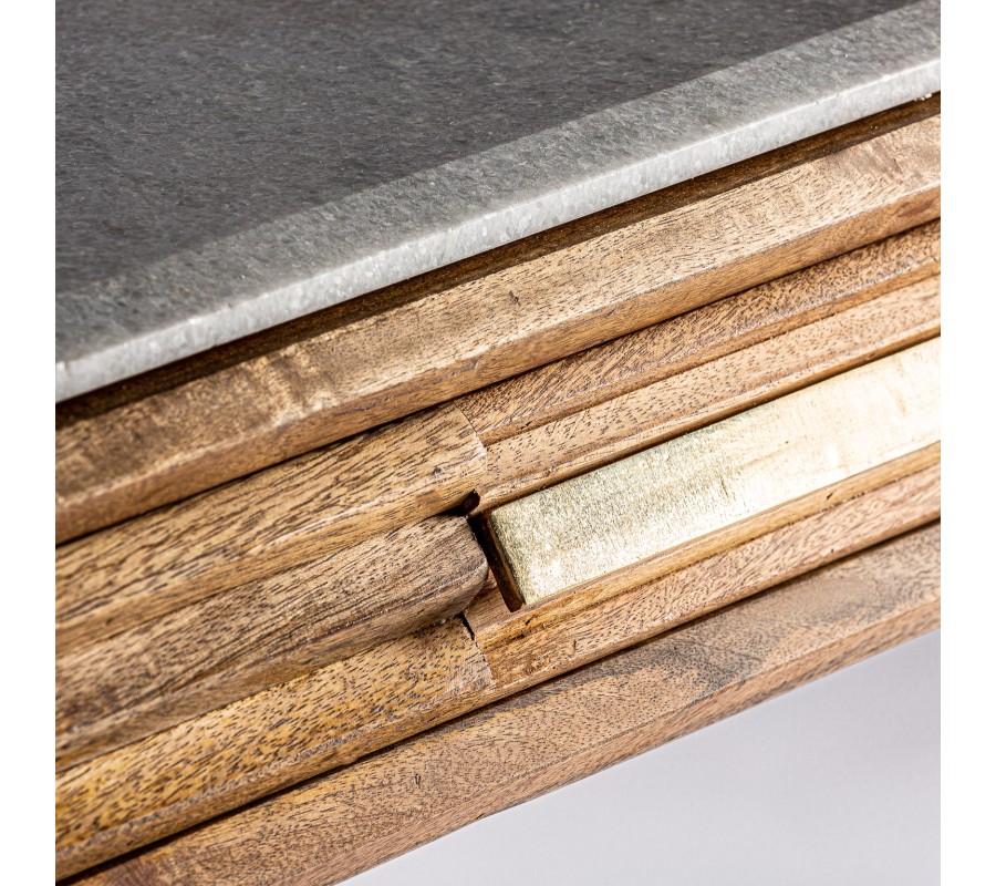 Dizajnový konzolový stolík Plissé Nature doplní váš interiér svojím krásnym vzhľadom a prevedením, ktoré rozhodne na seba upúta pozornosť. Dominantným a pútavým prvkom stolíka je jeho mramorová vrchná doska, typická pre kolekciu Plissé Nature. Doska sa nesie vo svetlo sivej farbe, ktorá pri osvetlení môže ísť do belšej farby, čo vytvorí krásnu kombináciu so svetlo hnedým mangovým masívom z ktorého je stolík vyhotovený. Spomenuté masívne drevo je vyrezávané vo forme horizontálnych línií, ktoré dotvárajú krásny vzhľad s jemným nádychom vidieckeho štýlu, ktorý možno cítiť vďaka svojmu naturálnemu povrchu. Konzola disponuje aj rozmernou zásuvkou, so štýlovým detailom vo forme zlatej kovovej rukoväte, ktorá dotvára vzhľad v štýle art-deco. Svetlý masív a mramorová doska vynikajúco vyniknú v tmavých interiéroch s nábytkom z kolekcie Plissé Nature alebo s podobnými svetlými masívnymi kúskami, a taktiež sa výborne kombinuje so zlatými kovovými doplnkami a dekoráciami.