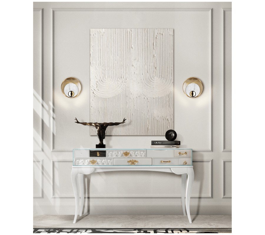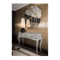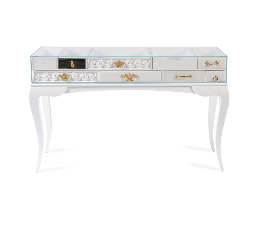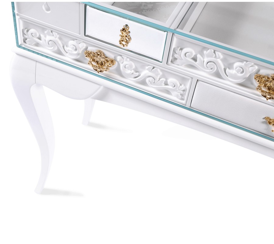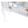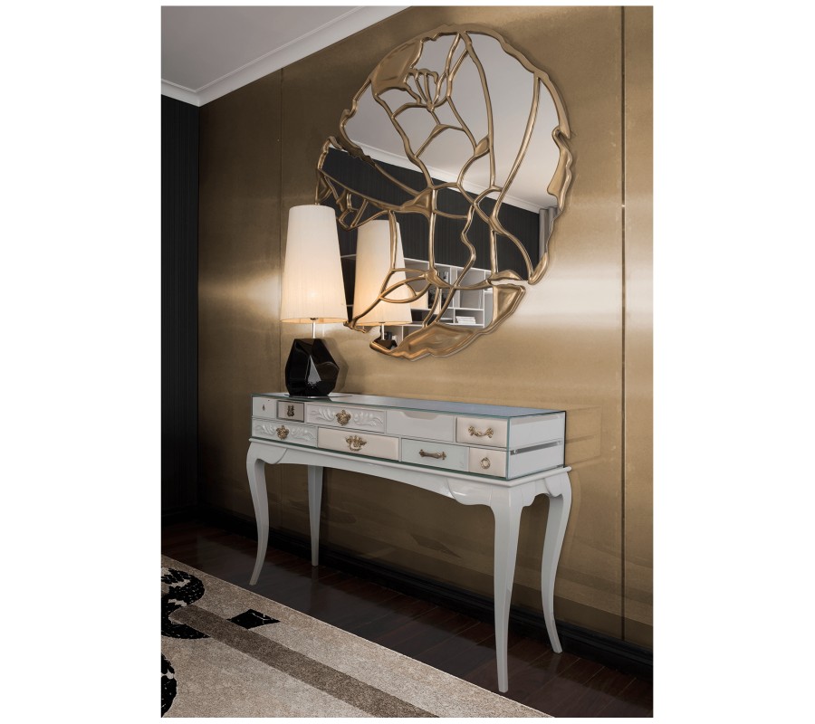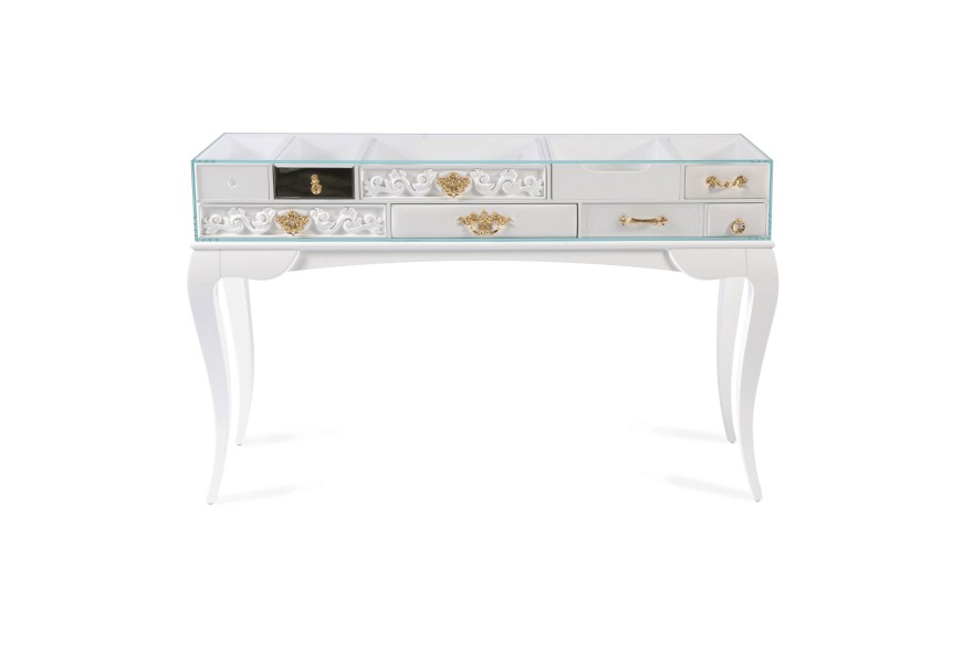 Luxusný konzolový stolík z našej exkluzívnej kolekcie Mondrian, typickej kombináciou dreveného masívu a skla, prinesie do vášho domova nádych unikátneho prepychu. Konzola Mondrian je nositeľom klasických prvkov, stávajúc sa tak jedným z najklasickejších kúskov tejto kolekcie. Vďaka harmonickej interpretácii moderných a aristokratických charakteristík sa bude vynikajúco vynímať napríklad v modernej vstupnej hale, vnášajúc tak elegantný vánok prepychu. Vysoký lesk bieleho laku je doplnený jemnými koženými akcentmi a detailnými rukoväťami. Podstava s tvarovanými chippendale nohami je vyrobená z kvalitného mahagónového masívu lakovaného bielym lakom s vysokým leskom, na ktorej je osadená skrinka z číreho skla, vyplnená deviatimi praktickými zásuvkami ponúkajúcimi dostatok úložného priestoru pre všetky vaše potrebnosti. Čelá ručne vyrobených zásuviek vytvárajú modernú súhru štýlov a techník, počnúc ozdobným vyrezávaním, cez kožené čalúnenie až po zrkadlo, nachádzajúc spoločný prvok v podobe pozlátených úchytiek.