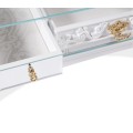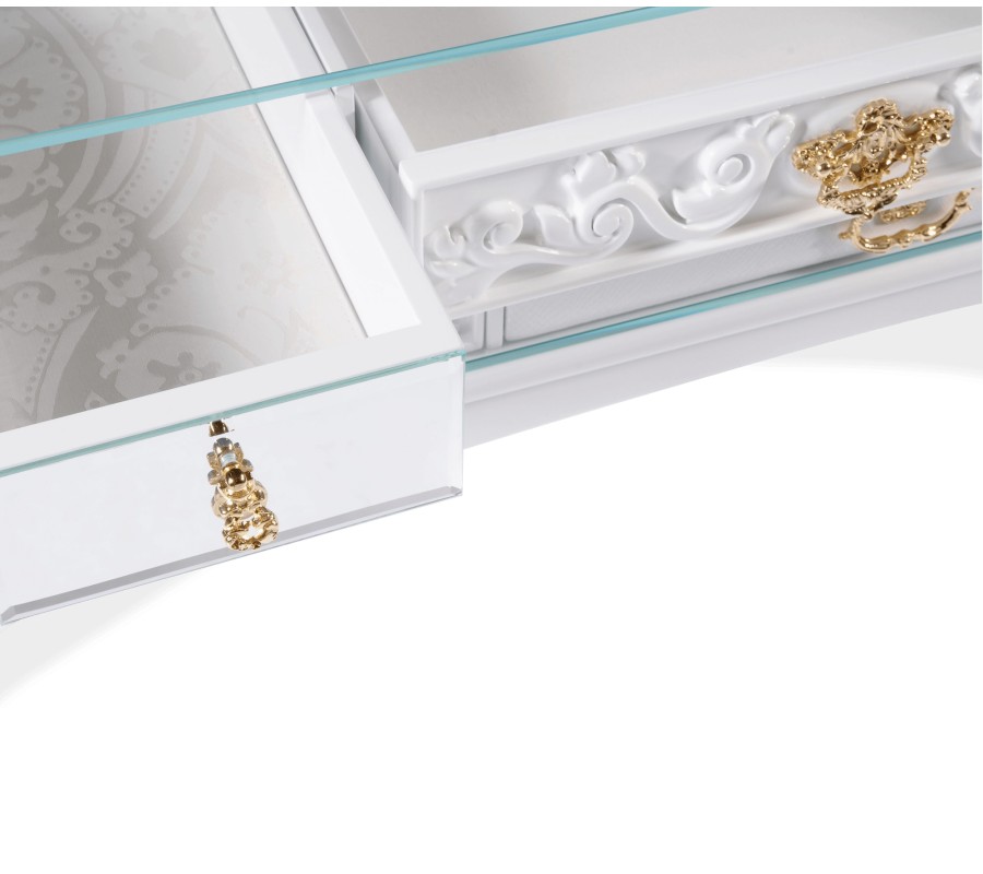Luxusný biely konzolový stolík Mondrian z lakovaného masívu a číreho skla s pozlátenými detailmi 85cm