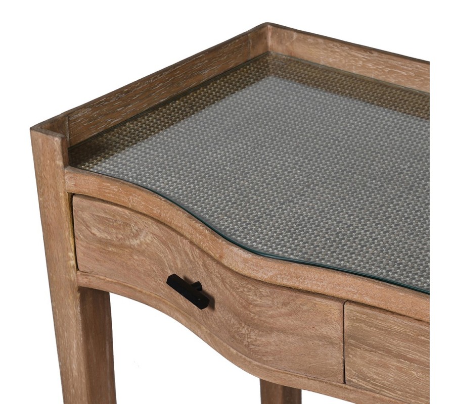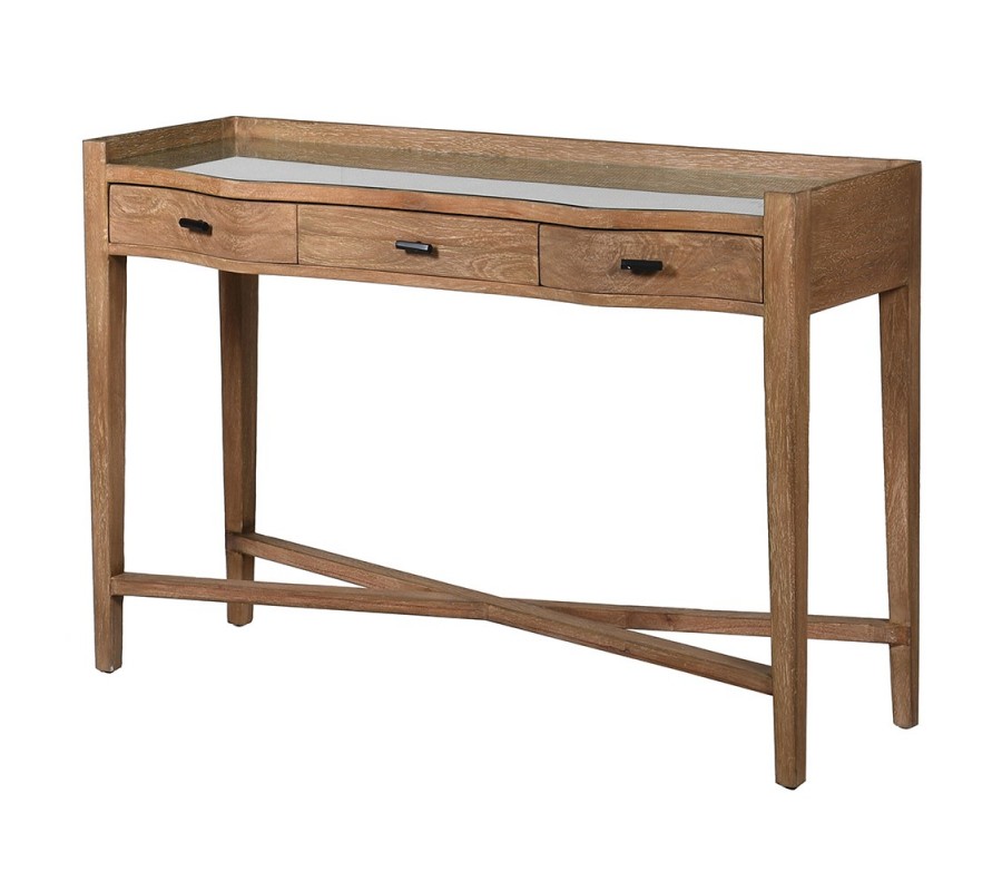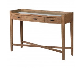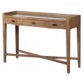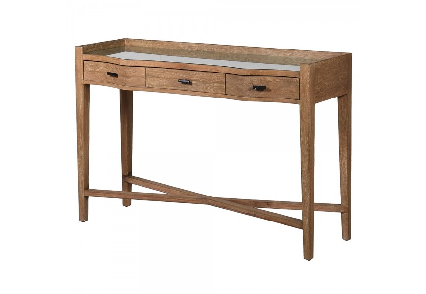 Masívny dizajnový konzolový stolík Barbadosa v naturálne hnedej farbe so sklenenou vrchnou doskou a troma zásuvkami 120cm