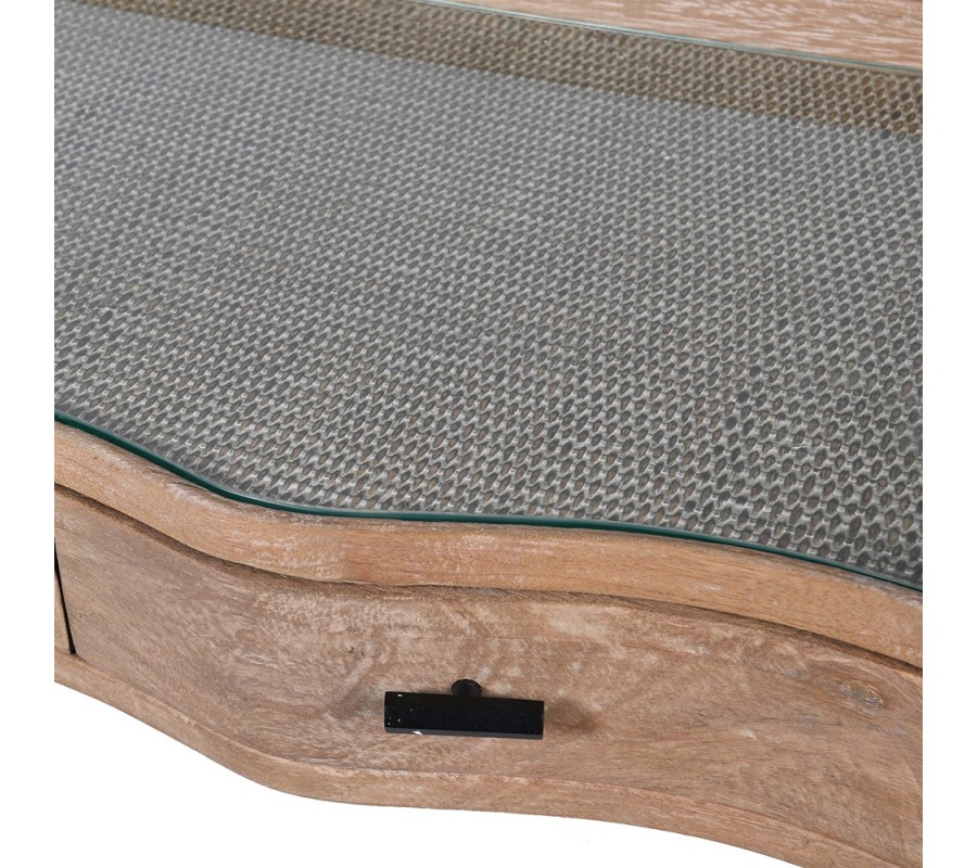 Rustikálny konzolový stolík do predsiene Barbadosa vás môže zaujať svojími ladnými oválnymi líniami, ktoré vytvárajú elegantný vzhľad v kombinácií s prevedením vrchnej dosky stolíka. Stolík je vyrábaný z masívneho dreva v prírodne hnedej farbe s naturálnou povrchovou úpravou vyzdvihujúcou prirodzenú štruktúru dreva. Na vrchnej doske sa nachádza trstinový výplet podobný ratanovému štýlu nábytku, ktorý je chránený doskou z tvarovaného a tvrdeného skla. Sklenená doska okrem ochrannej funkcie taktiež dotvára trendy dizajnovú stránku obdĺžnikového stolíka Barbadosa. Zaoblené línie sa nesú aj pri troch tvarovaných zásuvkách, ktoré disponujú výraznými čiernymi rukoväťami, ktoré podčiarkujú štýlové prevedenie tohto produktu. Stolík Barbadosa je postavený na štyroch priamych nožičkách, ktoré sú spojené podstavou v tvare písmena X. Masívny konzolový stolík taktiež odporúčame kombinovať do prírodne ladených predsieni alebo reprezentačných priestorov firiem a hotelov.