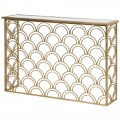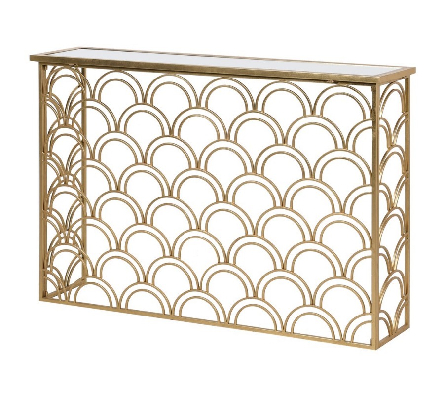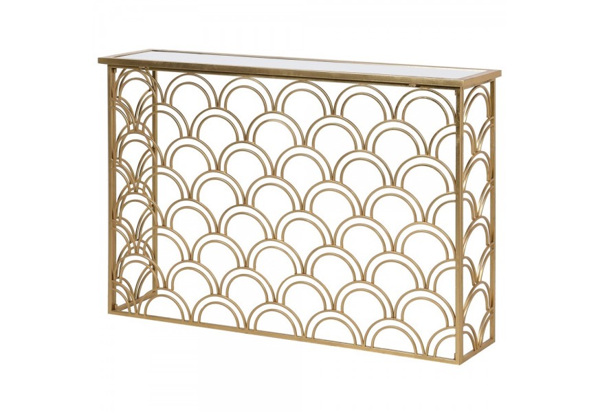 Art deco konzolový stolík Eloisse so zlatou kovovou konštrukciou a sklenenou povrchovou doskou 120cm