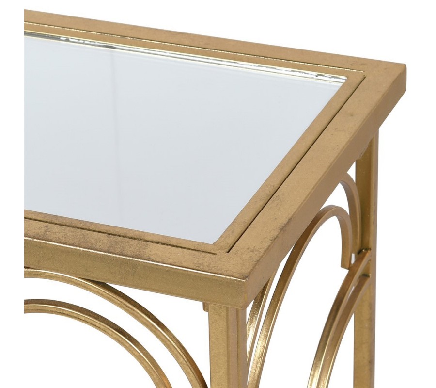 Exkluzívna konzola Eloisse je tým pravým kúskom pre milovníkov art-deco štýlu, ktorý si chcú doplniť priestory chodby, vstupnej haly či kancelárie dizajnovo zaujímavým a elegantným nábytkom. Táto konzola sa vyznačuje svojou zlatou konštrukciou z kovu s dizajnovým zdobením. pričom jej geometrické tvary ako napríklad poloblúky predstavujú jeden z hlavných znakov art-deco štýlu. Sklenená doska osadená v konštrukcii je doplnená zrkadlovým efektom, ktorý v kombinácii so žiarivou zlatou konštrukciou vytvára elegantný art-deco vzhľad. Dizajnová konzola Eloisse vďaka svojmu vzdušnému efektu dopomôže k optickému vzäčšeniu vašich priestorov, ale vynikne aj vo väčších miestnostiach. Pre dokonalý art-deco vzhľad odporúčame konzolu kombinovať s dizajnovým zrkadlom, obrazom s kovovým rámom či doplniť o štýlovú vázu zo skla alebo živé rastlinstvo.