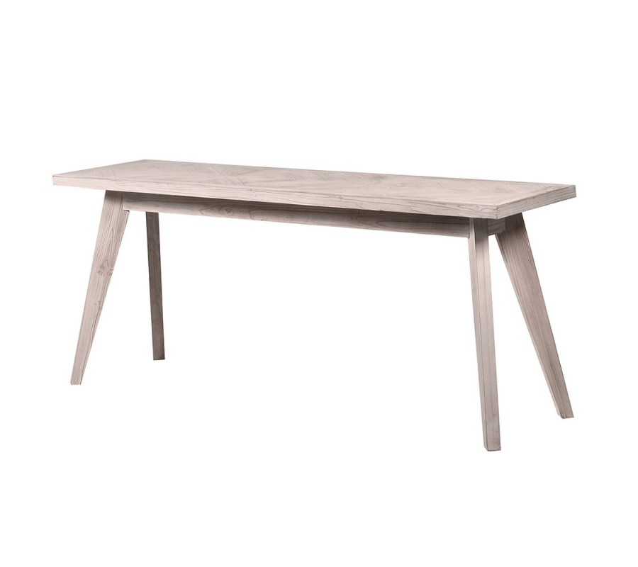 Dizajnový konzolový stolík z nábytkovej zostavy Parquet, vyniká jednoduchým dizajnom, ktorý kombinuje štýl retro a vidiecky štýl. Masívne drevo stolíka sa nesie vo vintage bielej až off white bielej farbe, pričom je drevo taktiež povrchovo upravené tak, aby vyzdvihovalo línie dreva. Celkový drevený vzhľad je usporiadaný na štýl parketového dizajnu. Úzka vrchná doska v obdĺžnikovom tvare s rozmermi 180x50cm je zasadená do podstavy so štyrmi dizajnovými šikmými nožičkami. Štýlová konzola Parquet vynikne v retro interiéroch v kombinácií s nábytkom Parquet alebo aj napríklad vo vidieckych interiéroch v kombinácií so živou zeleňou a svetlým nábytkom s viditeľnou štruktúrou dreva.