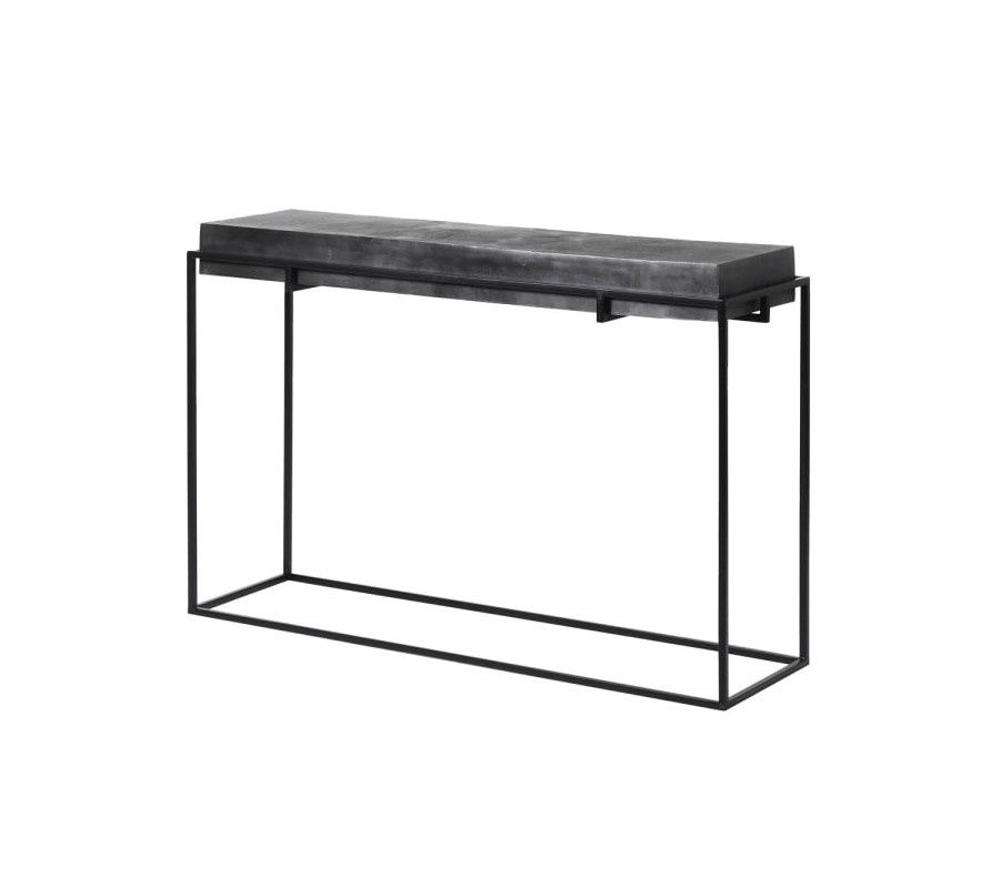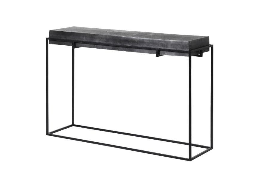Dizajnový konzolový stolík z našej kolekcie nábytku Black Iron si vás získa svojím nadčasovým moderným dizajnom s prvkami industriálneho štýlu. Je vhodným doplnkom do priestorov chodieb, predsiení či hotelových alebo firemných vstupných hál. Konzola je vyrobená z kovu. Mohutná povrchová doska tmavosivej farby je vsadená do jednoduchej čiernej geometrickej konštrukcie. Surové a minimalistické tvary konzoly a univerzálne tmavé farebné prevedenie navnadzujú industriálny nádych. Tento kúsok sa dá vhodne doplniť napríklad jednoduchým zrkadlom s kovovým alebo kamenným rámom, vázou s kvetmi či dizajnovým kovovým vešiakom. Odporúčame tiež kombináciu s ďalšími kúskami z kolekcie Black Iron.