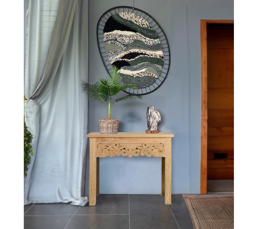Masívny koloniálny konzolový stolík Talia s ručne vyrezávaným predným štítom s orientálnymi prvkami 100cm