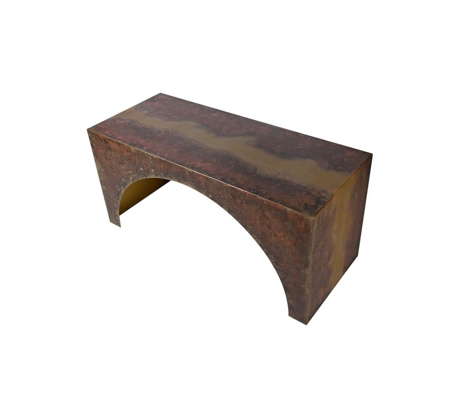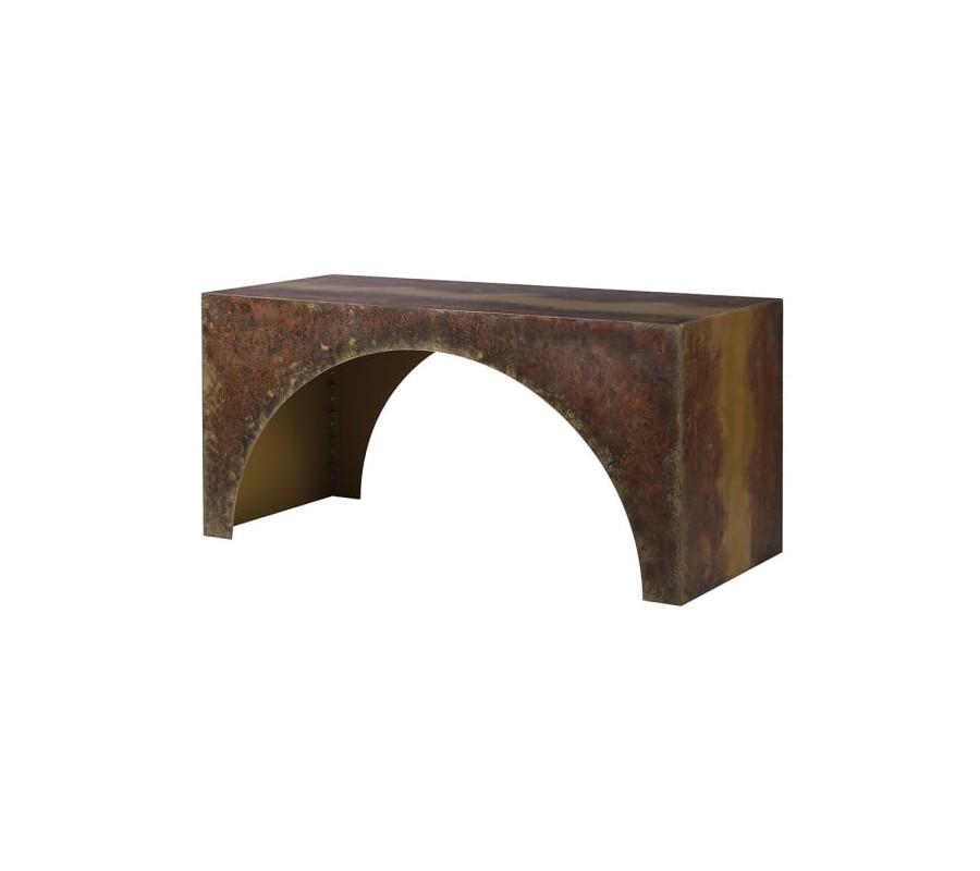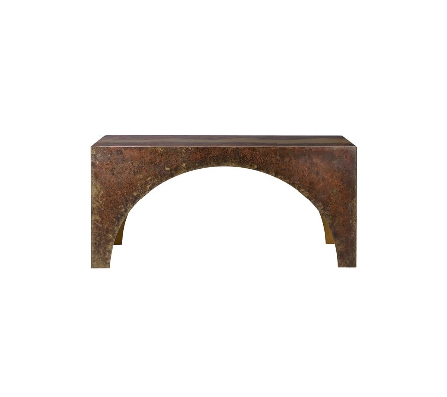 Luxusný konzolový stolík Oxidia zaujme svojím minimalistickým prevedením s prvkami industriálneho štýlu. Originálny je tiež jeho špecifický obdĺžnikový tvar s kopulovitým výrezom vytvárajúci luxusný vzhľad. Konštrukcia z kovu sa nesie v medenej farbe s jemnou patinou vytvárajúcou zaujímavý efekt oxidácie. Prepojením jednoduchých tvarov s kvalitným materiálom a modernou farebnosťou vzniká nadčasový kúsok, ktorý si svoje miesto nájde predovšetkým v industriálne ladených interiéroch. Prakticky poslúži vo vašej chodbe či predsieni, rovnako ako aj vo vstupnej hale hotelov či firemných priestorov. Výborne sa kombinuje s nábytkom v art-deco či industriálnom štýle, predovšetkým s kúskami z kovu. Odporúčame tiež kombináciu aj s ďalšími kúskami z našej kolekcie Oxidia.