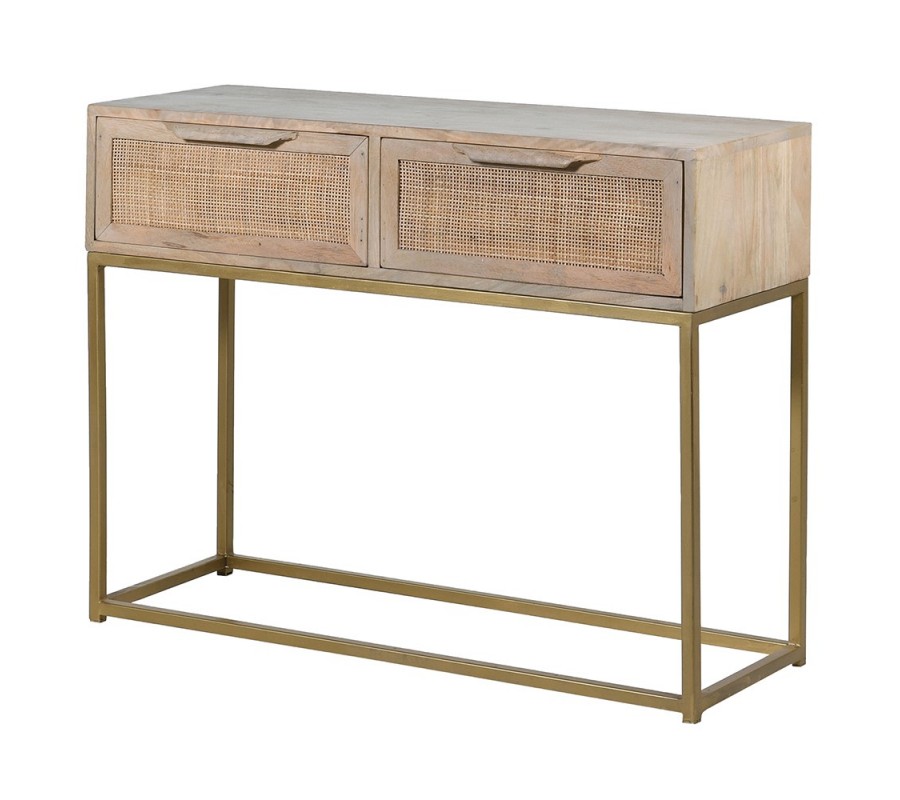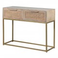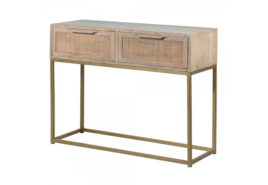 Vidiecky konzolový stolík Recto z mangového dreva s dvoma ratanovými zásuvkami s kovovou podstavou zlatej farby 100cm