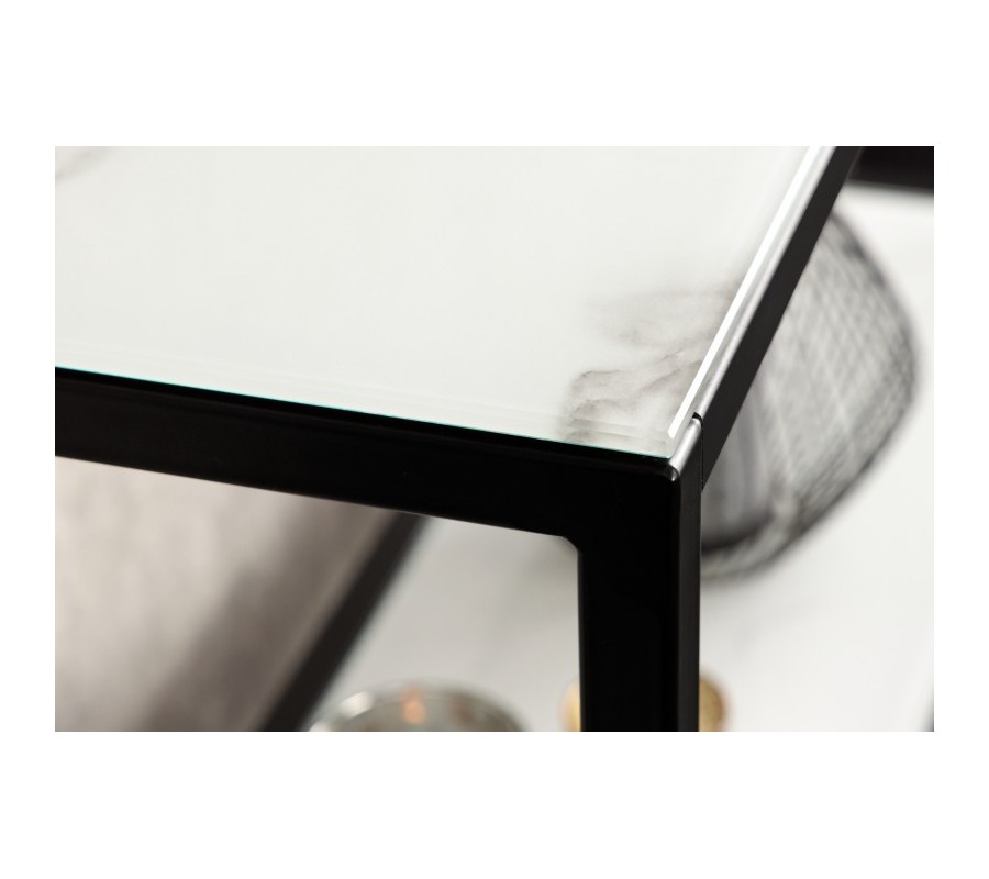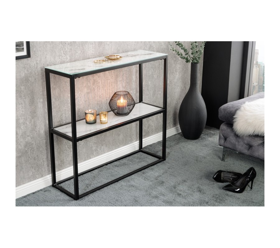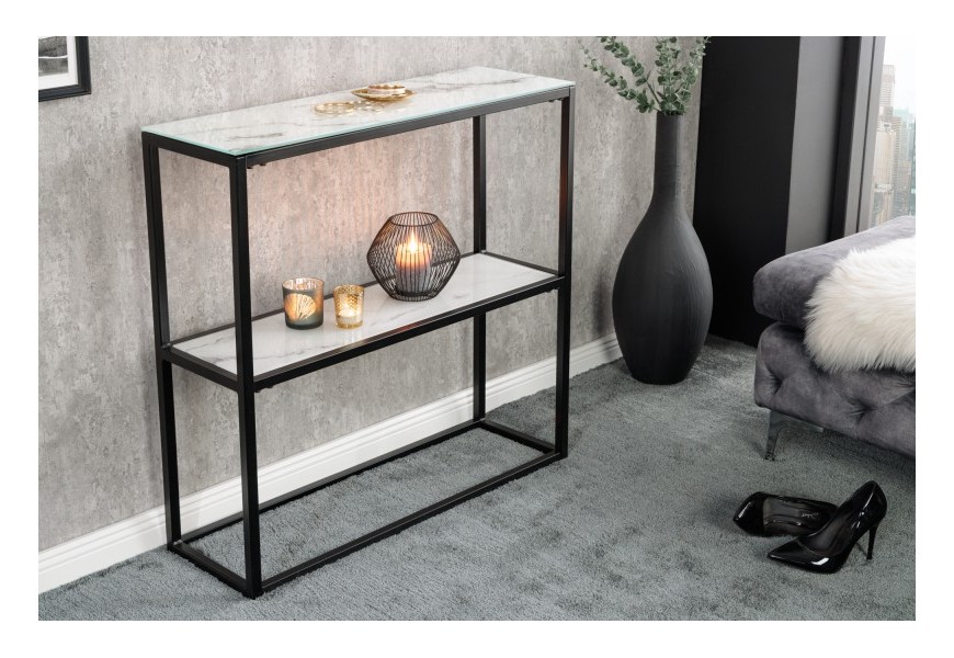 Industriálna konzola Industria Marbleux so sklenenou doskou v prevedení biely mramor s čiernou kovovou konštrukciou 81cm