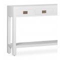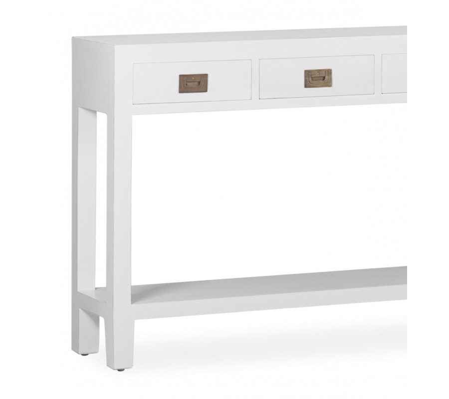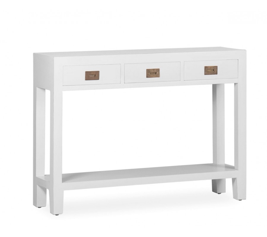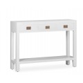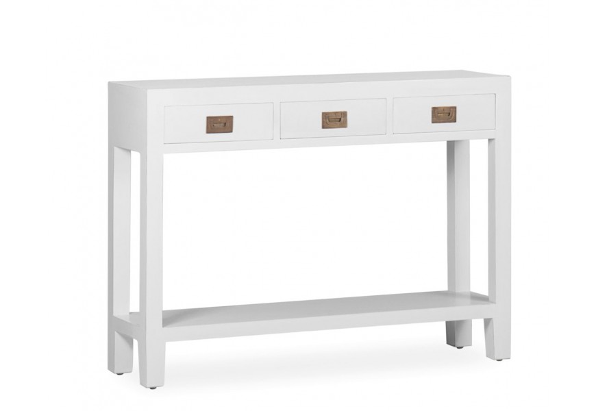 Klasický konzolový stolík Blanc z masívneho dreva mindi s bielou povrchovou úpravou a s tromi zásuvkami 110cm