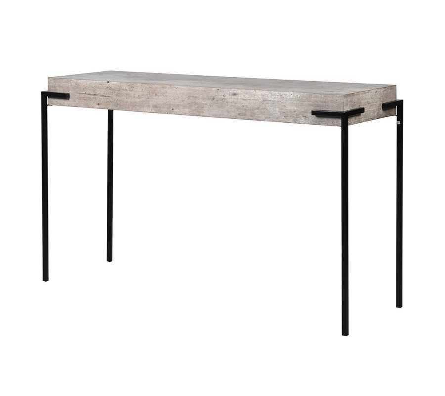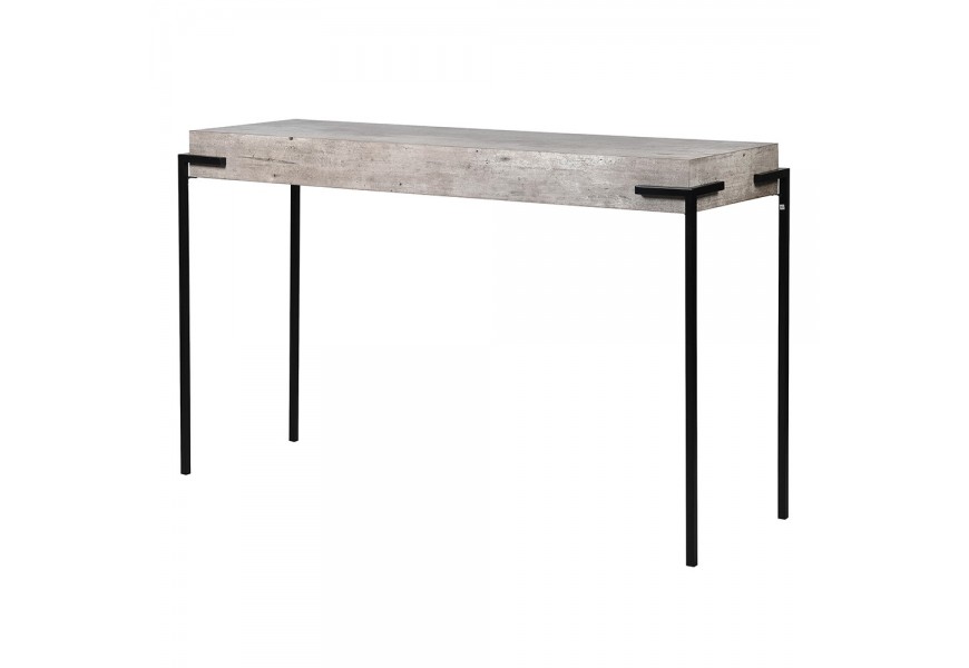 Moderný industriálny konzolový stolík Maelynn z dreva s čiernymi kovovými nožičkami betónový sivý 123cm