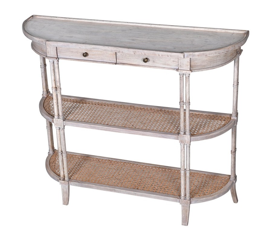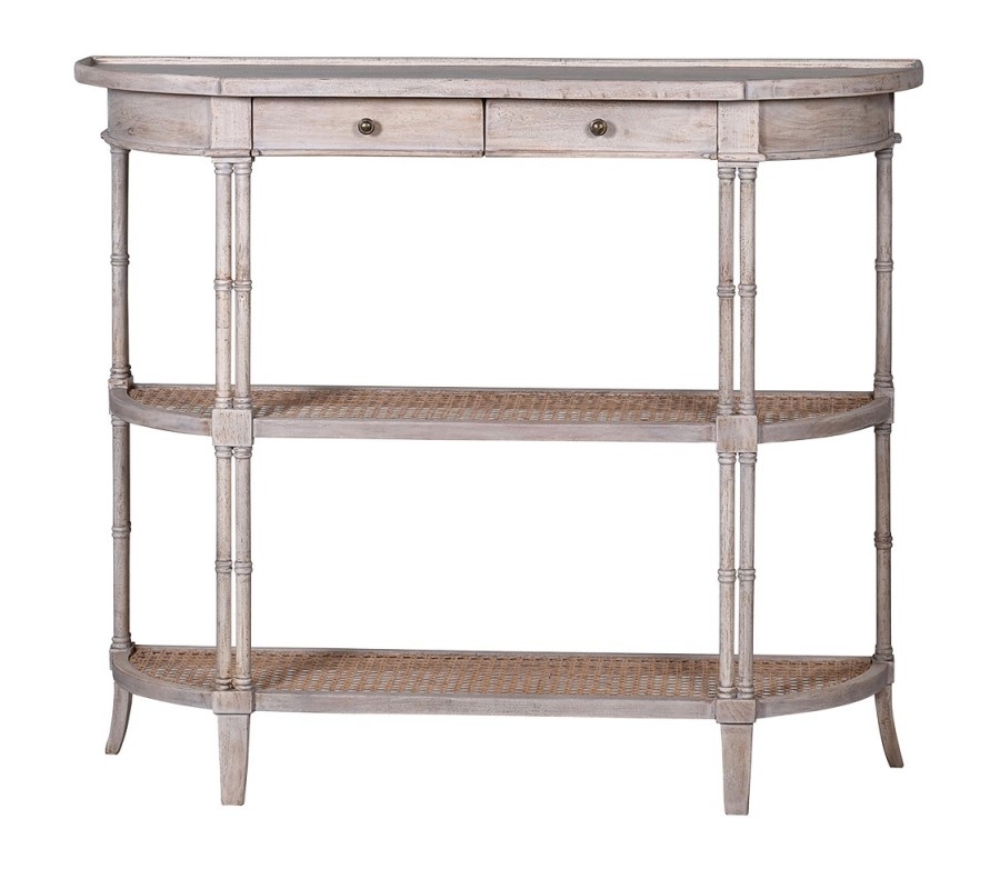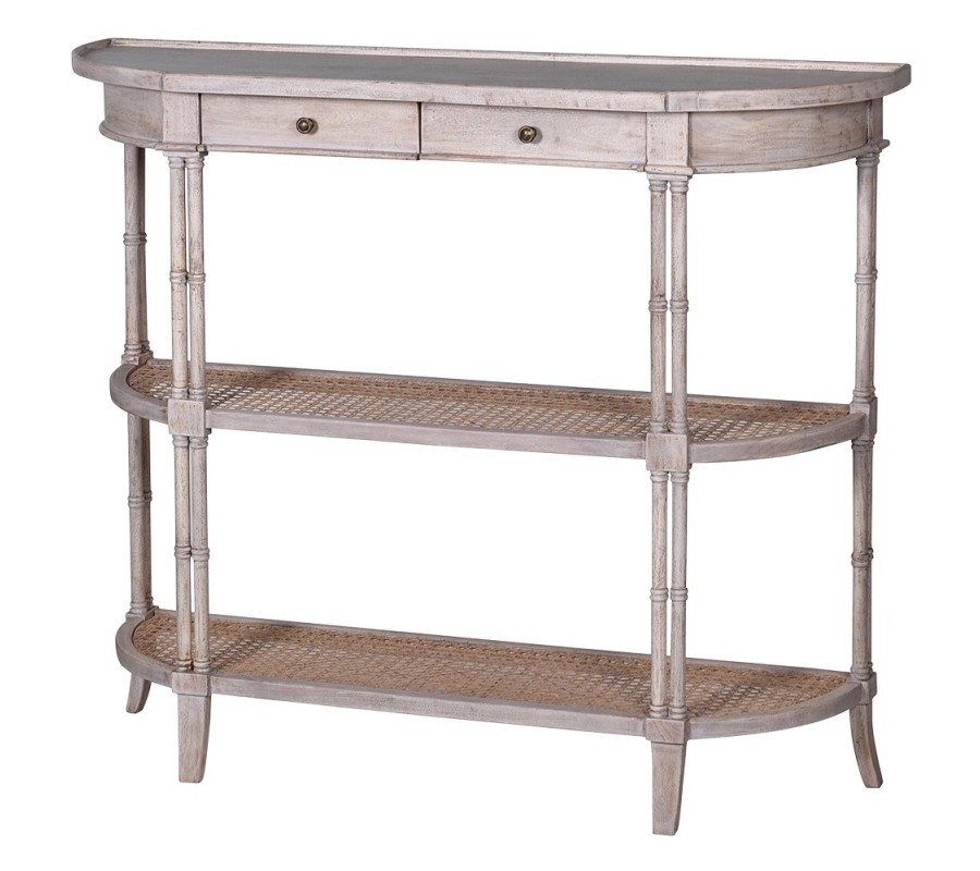 Konzolový stolík z našej kolekcie Nature je predstaviteľom rustikálneho štýlu. Jeho konštrukcia pozostáva z masívneho akáciového tela v svetlej sivohnedej farbe a poličiek so štýlovým ratanovým výpletom. Zaujímavým je tiež obdĺžnikový tvar so zaoblenými prednými rohmi, čo vytvára polblúkovitý efekt s nádychom vintage štýlu. K tomu priespieva tiež nádherné ručné vyrezávanie na nožičkách dodávajúce konzole unikátny rustikálny vzhľad. Konzola Nature okrem dvoch praktických ratanových poličiek disponuje aj dvomi zásuvkami vo vrchnej časti, vďaka čomu je nielen dizajnovo pútavým, ale aj praktickým a funkčným kúskom. Svoje miesto si nájde v každej vintage či rustikálne ladenej predsieni, vstupnej hale či chodbe, či už ide o súkromné domácnosti alebo priestory luxusných hotelov alebo kancelárií. Pre zjednotenie vašich priestorov a vytvorenie nezameniteľného rustikálneho štýlu odporúčame konzolu kombinovať aj s ďalšími kúskami z kolekcie Nature.