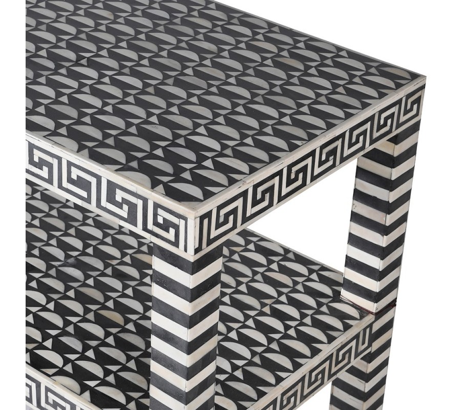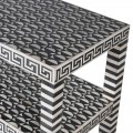 Exkluzívny konzolový stolík Garibaldi zaujme svojím originálnym vzhľadom kombinujúcim prvky vintage a art-deco štýlu. Jeho dominantou je nádherné zdobenie tvorené technikou intarzie, pričom kombinuje materiály masívneho mangového dreva, ťavej kosti a živice. Týmto precíznym zdobením vzniká štýlový geometrický vzor tvorený ukladaním jednotlivých kúskov materiálu vedľa seba. Farebná kombinácia čiernej a bielej dodáva stolíku Garibaldi štýlový retro efekt. Detailné a precízne zdobenie pokrýva celú vrchnú dosku, praktickú poličku aj jemne zaoblené elegantné nožičky, ktoré sú v spodnej časti doplnené zdobením v zlatej farbe. Konzola Garibaldi nádherne doplní art deco alebo vintage zariadené predsienie či chodby vášho príbytku, rovnako ako aj priestory tématicky ladených hotelov či luxusných firemných recepcií. Doplnením dekorácií z kovu v zlatej farbe umocníte štýlový art deco efekt, ktorý vo vašich priestoroch vytvorí honosný glamour efekt!
