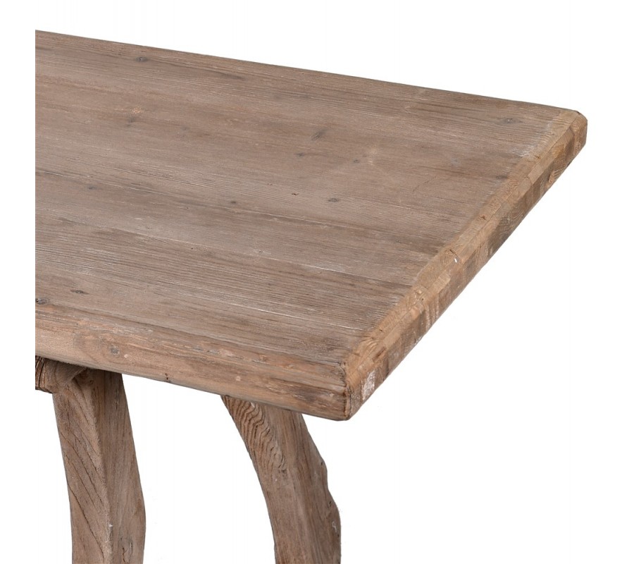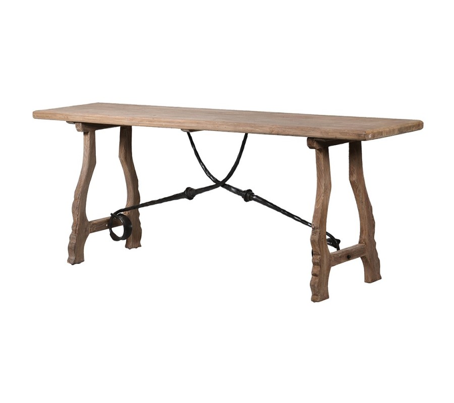 Vidiecky konzolový stolík Woodley je nádherným dizajnovým kúskom, ktorý zhmotnňuje princípy vidieckeho štýlu. Konzola Woodley je vyrobená z kombinácie masívneho brestového dreva a preglejky, vďaka čomu si získava svoju pevnú dosku, a dizajnové nožičky. Spomenuté nožičky sa nesú v krásnom ručne vyrezávanom vidieckom prevedení, čo dopĺňa čierna železná dekorácia v podobe ručne kovanej zakrútenej tyče. Celkový vzhľad a kvalitné prevedenie stolíka sa tak stanú lákadlom pre oči, preto je vhodný aj na umiestnenie do vidieckych reštaurácií a podnikov. Vidiecky konzolový stôl Woodley sa vďaka svojmu rozmeru radí medzi väčšie konzoly, preto ho odporúčame kombinovať v rozmernejších vidieckych priestoroch, kde si nájde dostatok dekorácií a iného nábytku, s ktorým perfektne vynikne či už vyrezávanie, alebo železný dekor.
