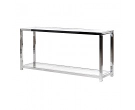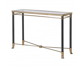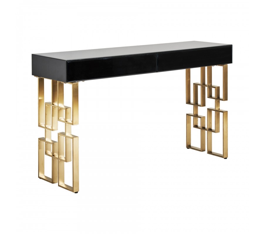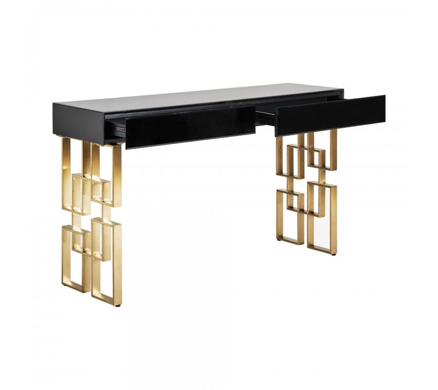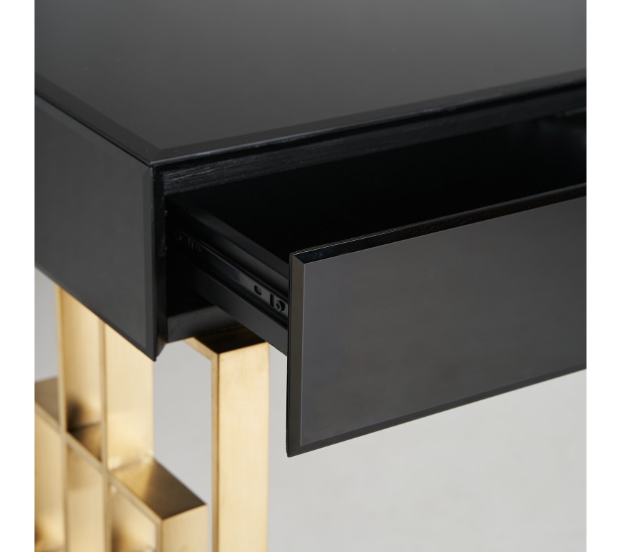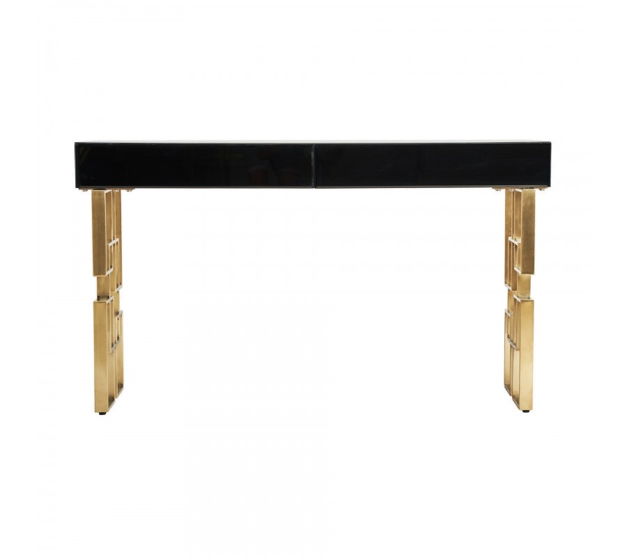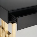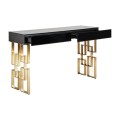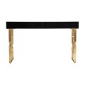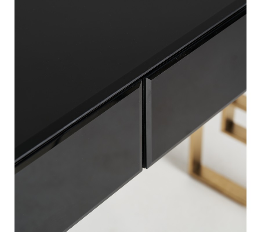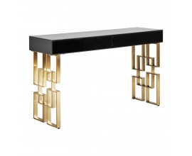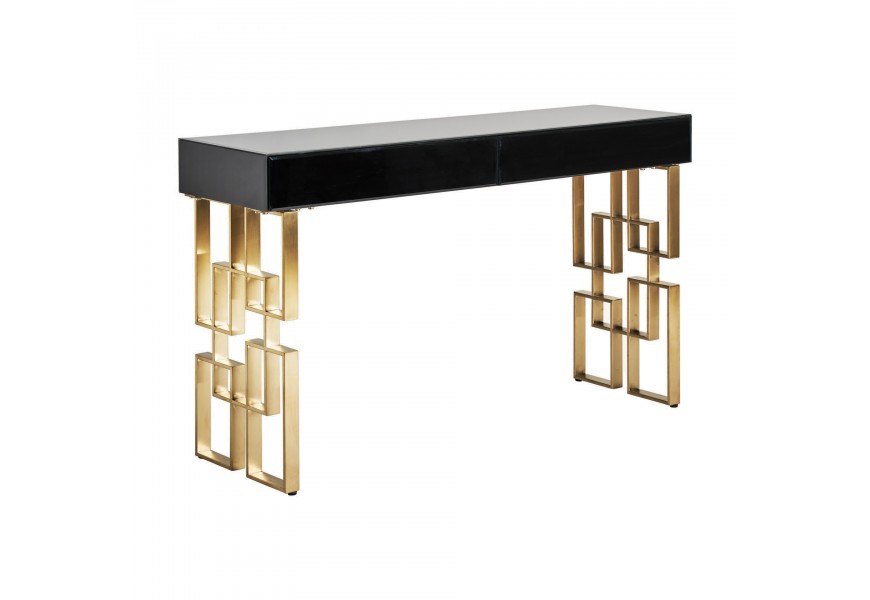 Art-deco konzolový stolík Gasol v čiernom zrkadlovom prevedení s dvomi zásuvkami a dizajnovými nožičkami v zlatej farbe 140cm