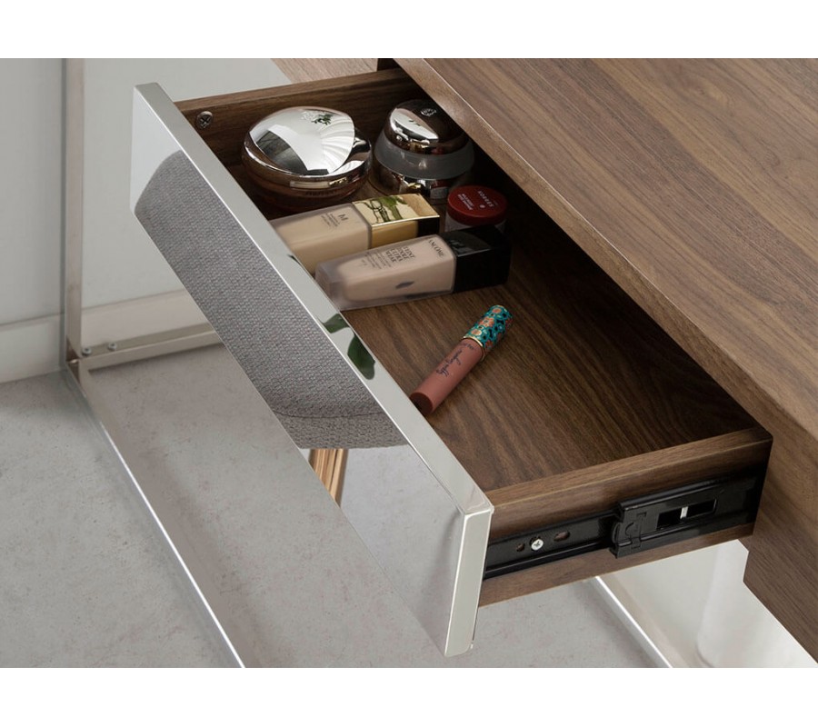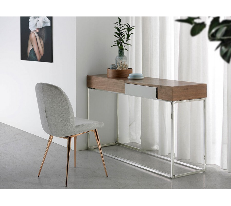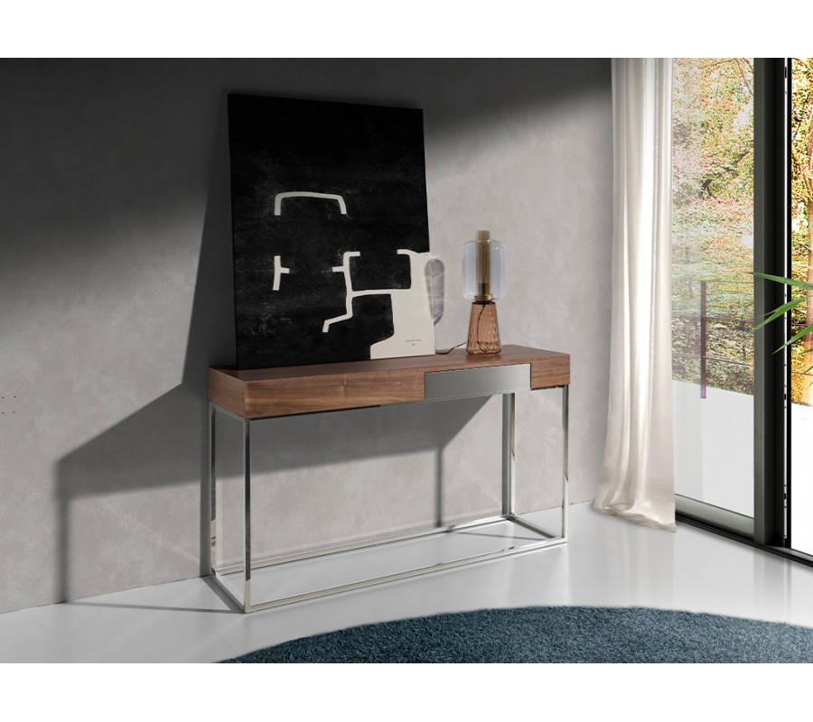 Spomenuté prírodné vyhotovenie je dosiahnuté vďaka drevenej vrchnej doske, obohatenej o kvalitné orechové dyhovanie v hnedej farbe, ktoré kladie dôraz na prirodzenú štruktúru dreva. Orechová dyha konzoly Forma Moderna je v krásnom kontraste s chrómovanými nožičkami z nehrdzavejúcej ocele, ktoré dodajú svieži svetlý nádych a sofistikovaný dizajn.