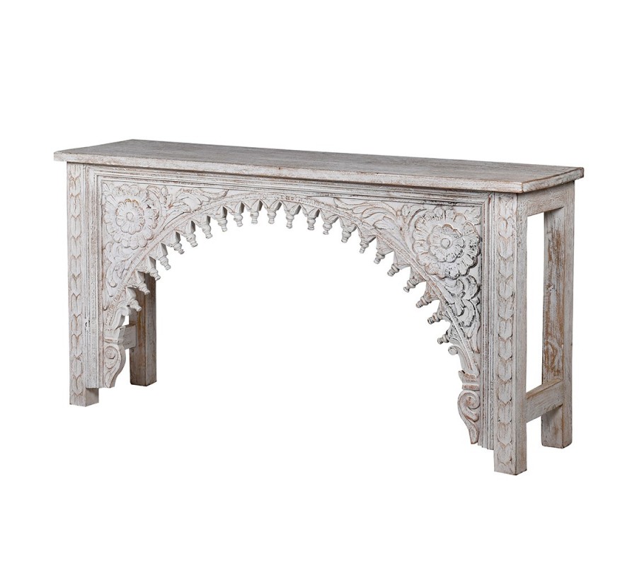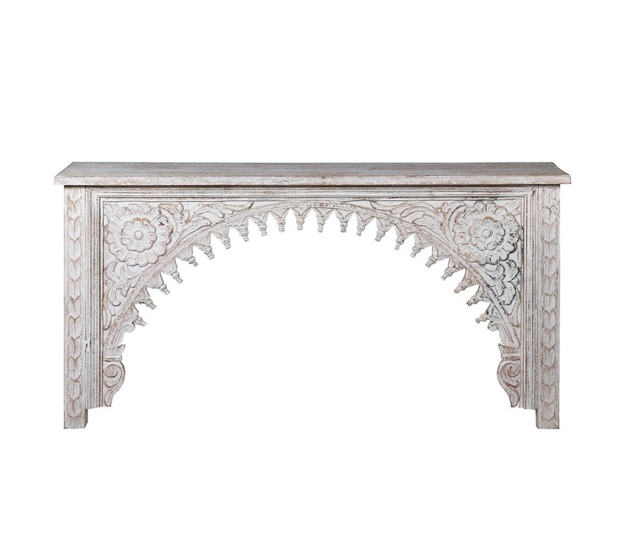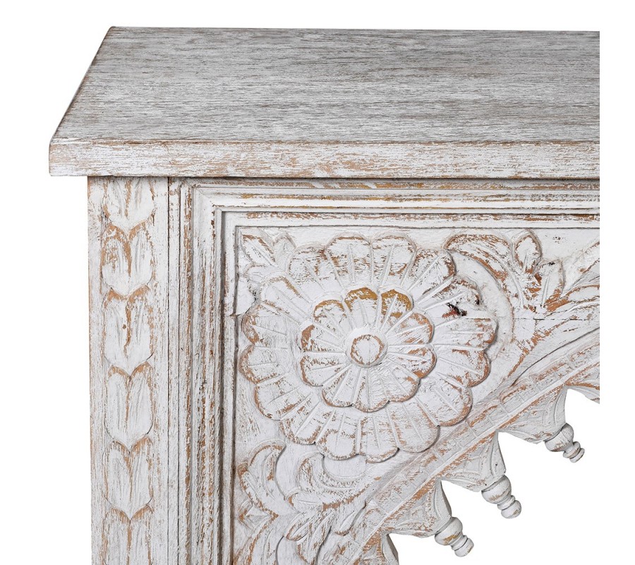 Štýlová konzola Perikles vyniká svojím nádherným ornamentálnym zdobením, ktoré z nej robí unikátny kúsok. Je vyrobená z kvalitného masívneho mangového dreva, pričom povrchová úprava sa nesie v svetlej bielo-hnedej farbe. Dopĺňa ju výrazná vintage patina, ktorá spolu s precíznym a detailným vyrezávaním pôsobí ako dominantný prvok po estetickej stránke. Vyrezávané zdobenie kombinuje florálne, abstraktné a geometrické motívy a zdobí celé telo konzoly. Klasický obdĺžnikový tvar je z prednej strany doplnený o polkruhový motív, na ktorom práve vyrezávané motívy najkrajšie vynikajú. Konzola Perikles vkusne doplní vintage, provensálske i orientálne ladené priestory. Umiestnením konzoly do vašej predsiene, vstupnej haly či chodby získate nielen praktický odkladací priestor, ale aj jedinečný esteticky príťažlivý doplnok.