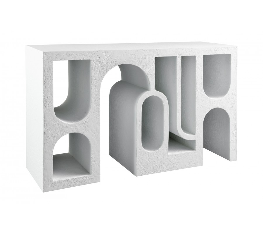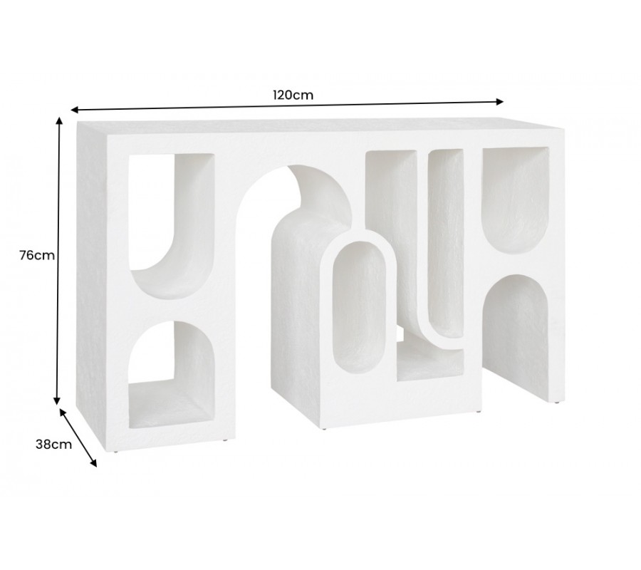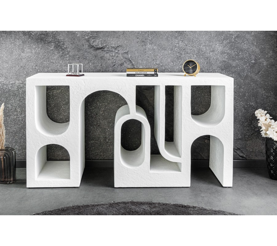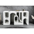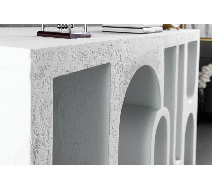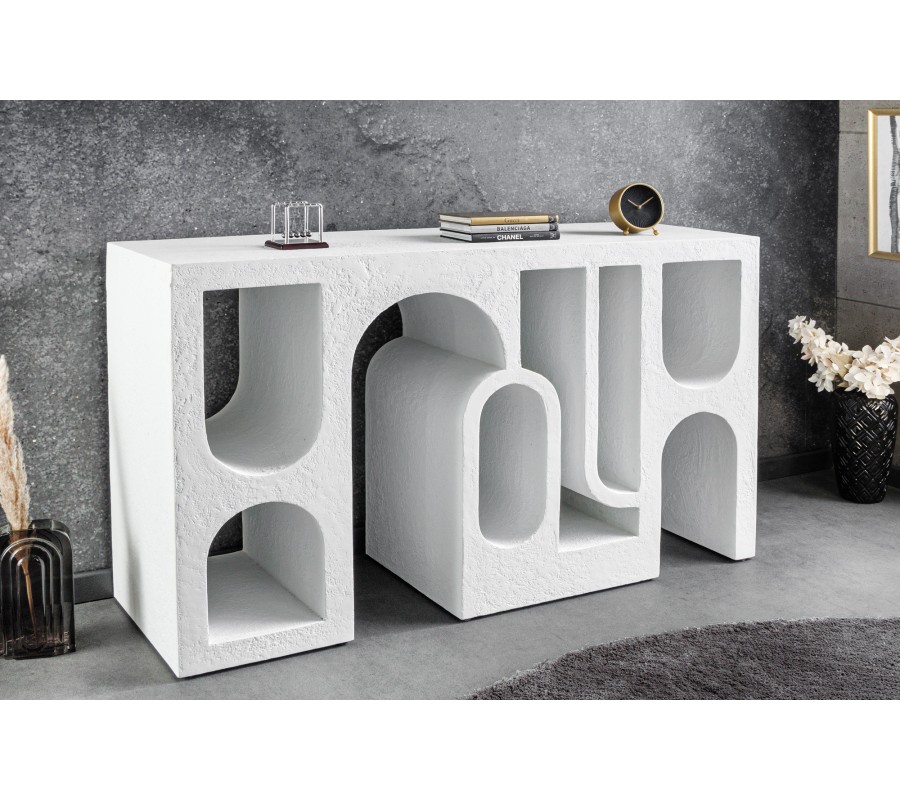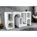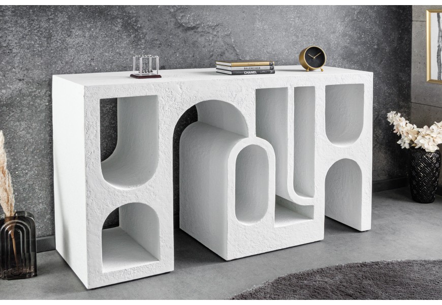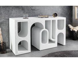 Dizajnový art deco betónový konzolový stolík Gerin s geometrickým zdobením v bielej farbe 120 cm