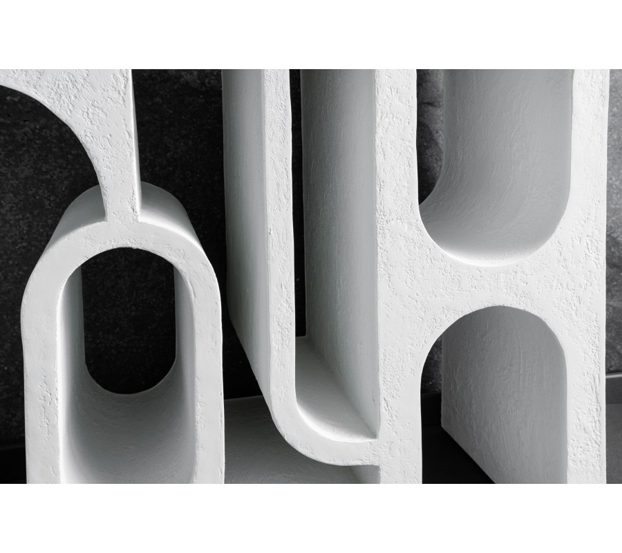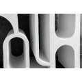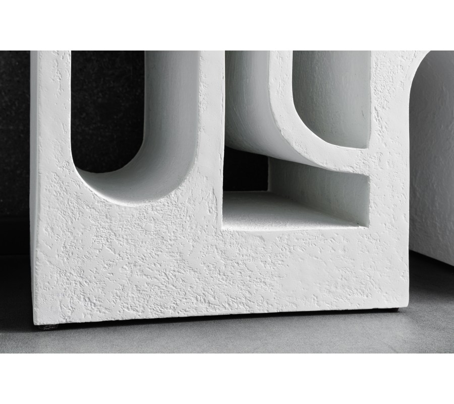 Stolík je vyrobený z betónu v bielej farbe, čo mu dodáva zaujímavú povrchovú štruktúru. Má modernú lineárnu siluetu, ktorá pôsobí mohutným dojmom. Dizajnu dominujú geometrické výrezy poloblúkového tvaru, ktoré vytvárajú abstraktný vzor inšpirovaný estetikou art deco štýlu. Okrem dekoračnej funkcie ich môžete využiť aj ako dodatočné police.