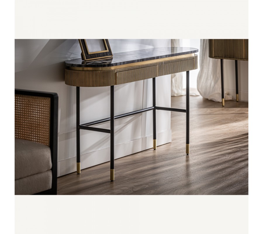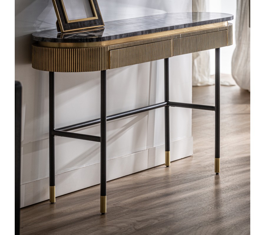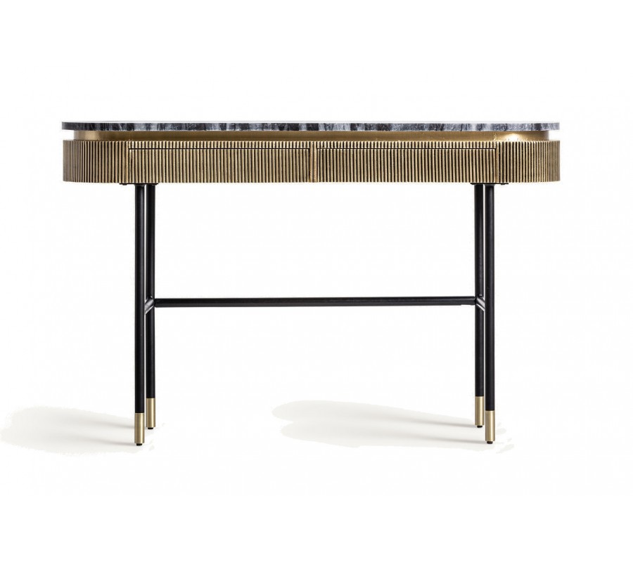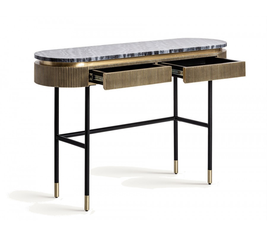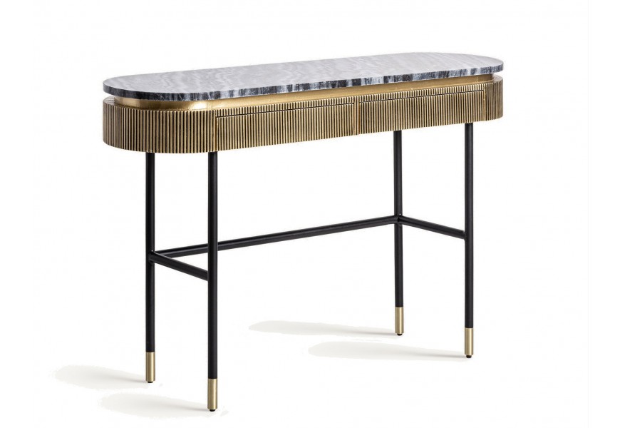 Luxusný oválny zlatý glamour konzolový stolík Chamoix s dvomi zásuvkami a čiernou mramorovou vrchnou doskou 130 cm