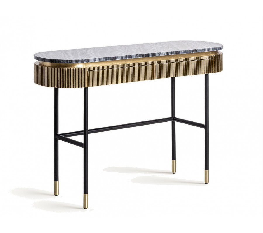 ►Dizajnové a luxusné konzolové stolíky ►Art-deco nábytok ►Oválny ►S nožičkami ►So zásuvkami ►Kov ►Čierna ►Zlatá ►Mramor ►Nábytok v Glamour štýle ►Konzolové stolíky z kovu ►Moderné konzolové stolíky ►Kolekcia luxusného zlatého glamour nábytku Chamoix