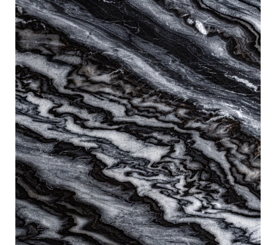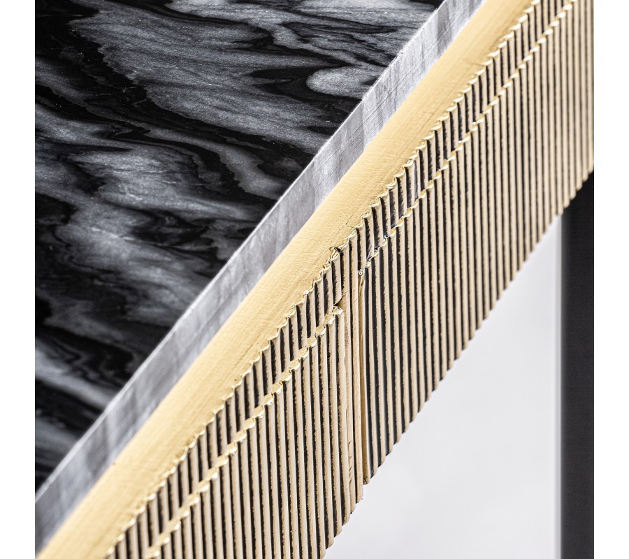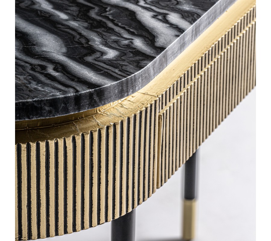 V siluete stolíka dominuje oválna vrchná časť, doplnená striktnými rovnými líniami v tvare nožičiek a v reliéfnom zdobení. Vrchná doska je zhotovená z nádherného čierneho mramoru s prirodzenou svetlou kresbou. Je uložená na nízkej hladkej podstave v zlatej farbe, ktorá je umiestnená na tiež kovovom úložnom priestore s dvomi praktickými zásuvkami. Jeho obvod je ozdobený výrazným vertikálnym rebrovaným reliéfom. Plastickú štruktúru zdôrazňuje čierna farba v hlbokých drážkach a zlatá farba na vyvýšených častiach.