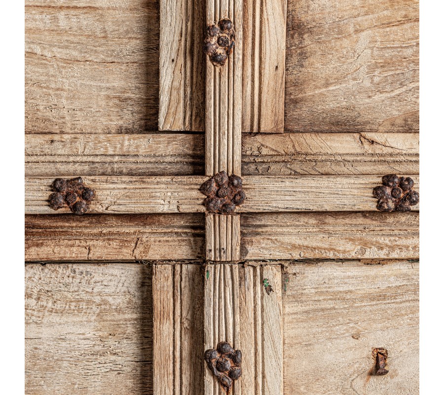 Stolík je zhotovený z teakového dreva v svetlej hnedej farbe. Jeho odtieň pôsobí teplým dojmom a aj napriek bohatému dizajnu, vyzdvihuje do popredia prírodný charakter materiálu. Jeho povrch je zámerne zostarnutý a nábytok tak pôsobí starožitným dojmom.