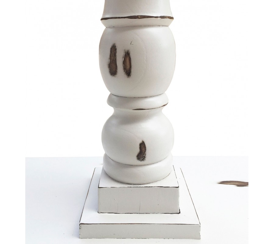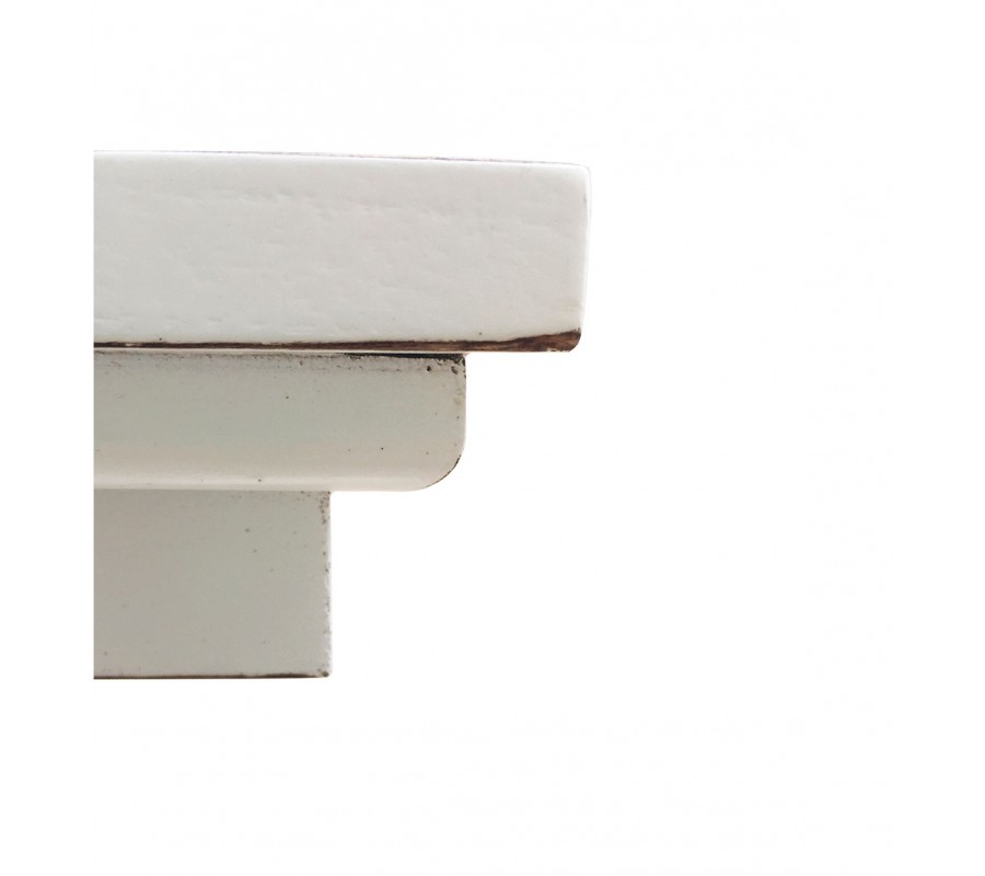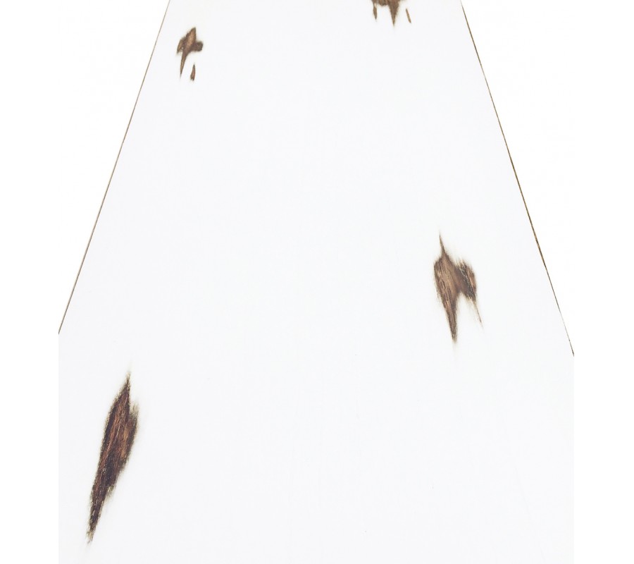 Stolík je vyrobený z masívneho dreva mindi, ktoré je obľúbené vďaka svojej tvrdosti a odolnosti. Povrch je pokrytý bielym náterom, ktorý je následne na hranách a niektorých ďalších miestach zošúchaný. Tento efekt zámerného zostarnutia dodáva nábytku starožitný vzhľad.