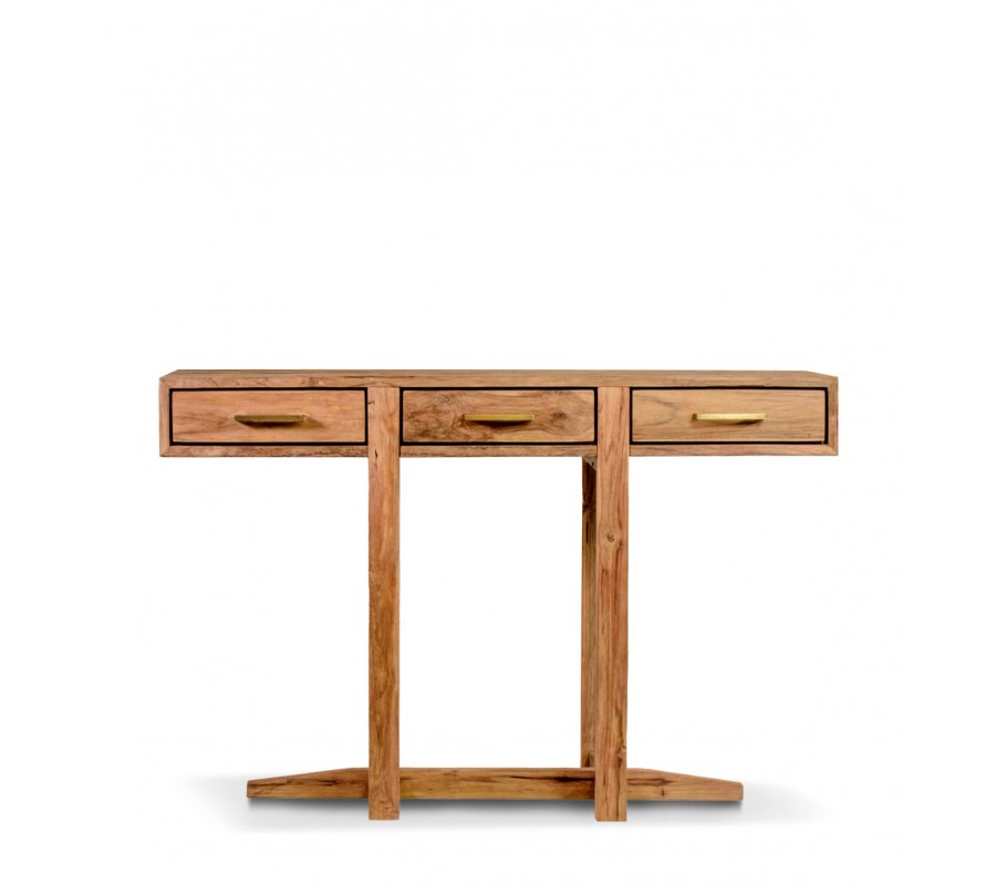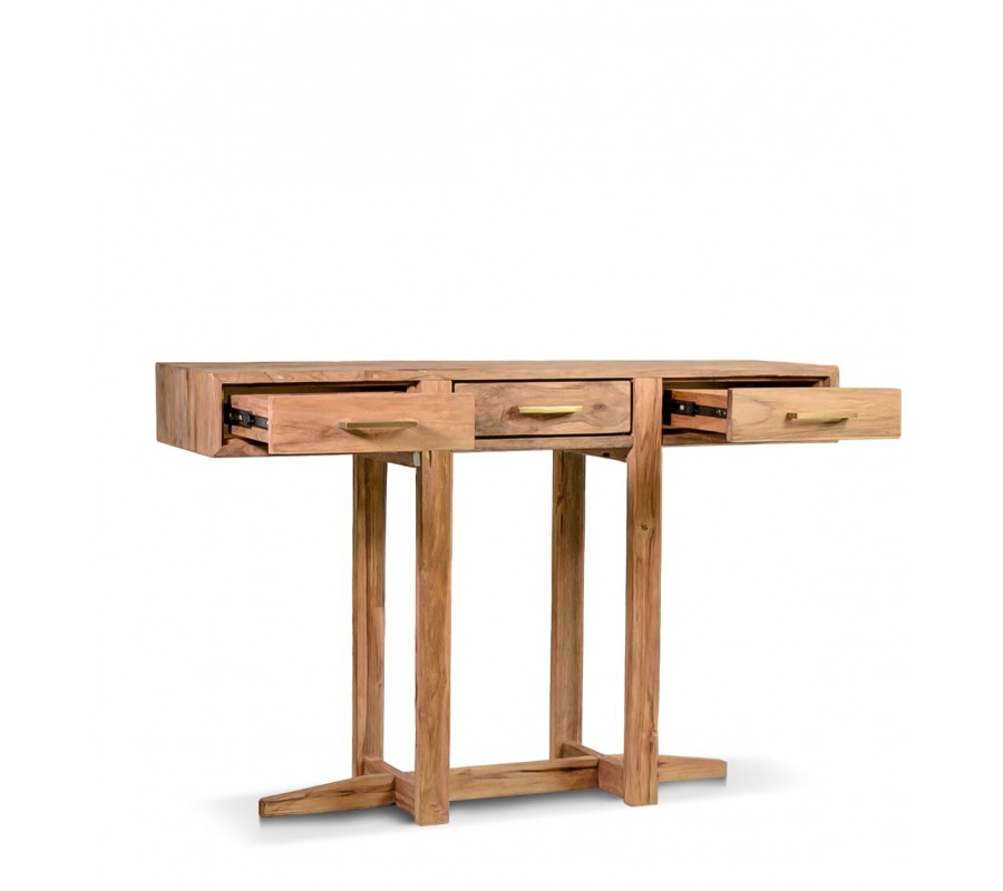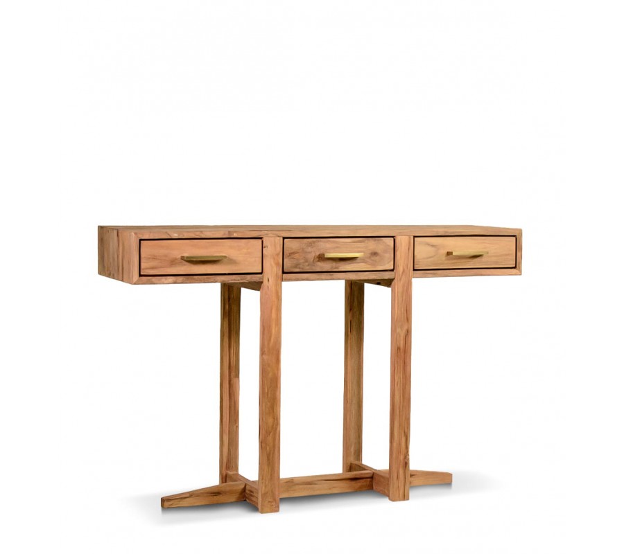 Moderný masívny konzolový stolík Vergil z tekového dreva s tromi zásuvkami v prírodnej hnedej farbe 130 cm
