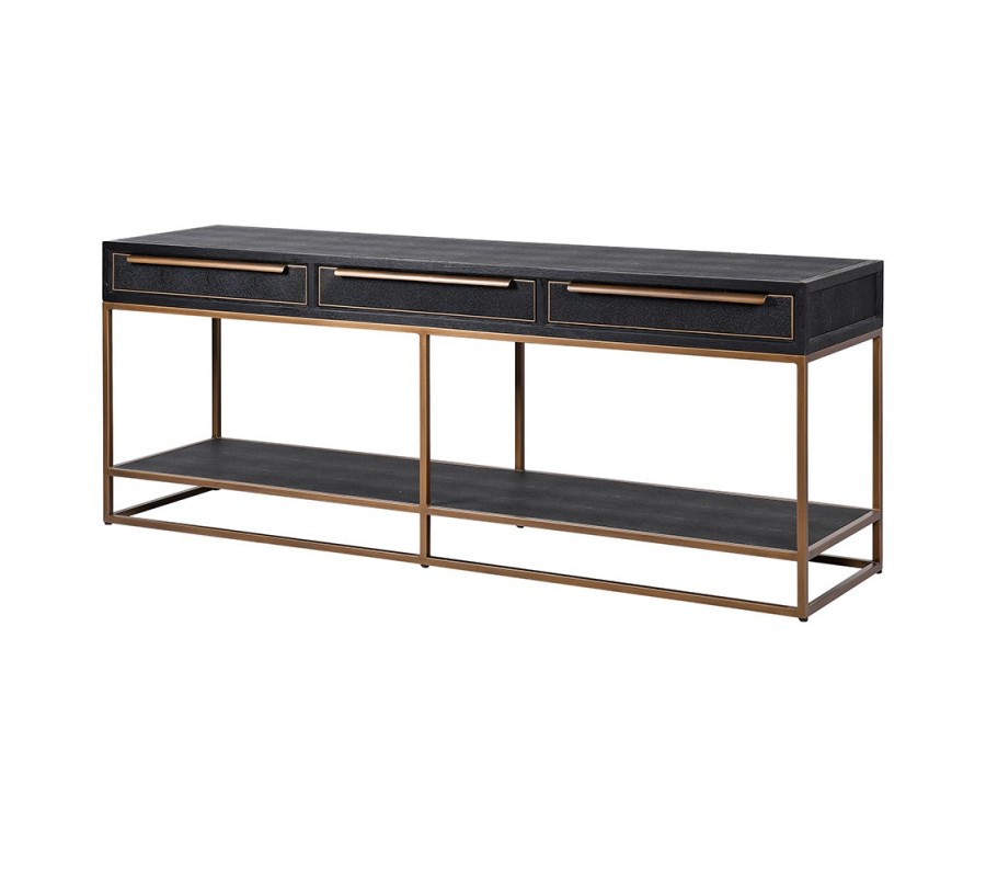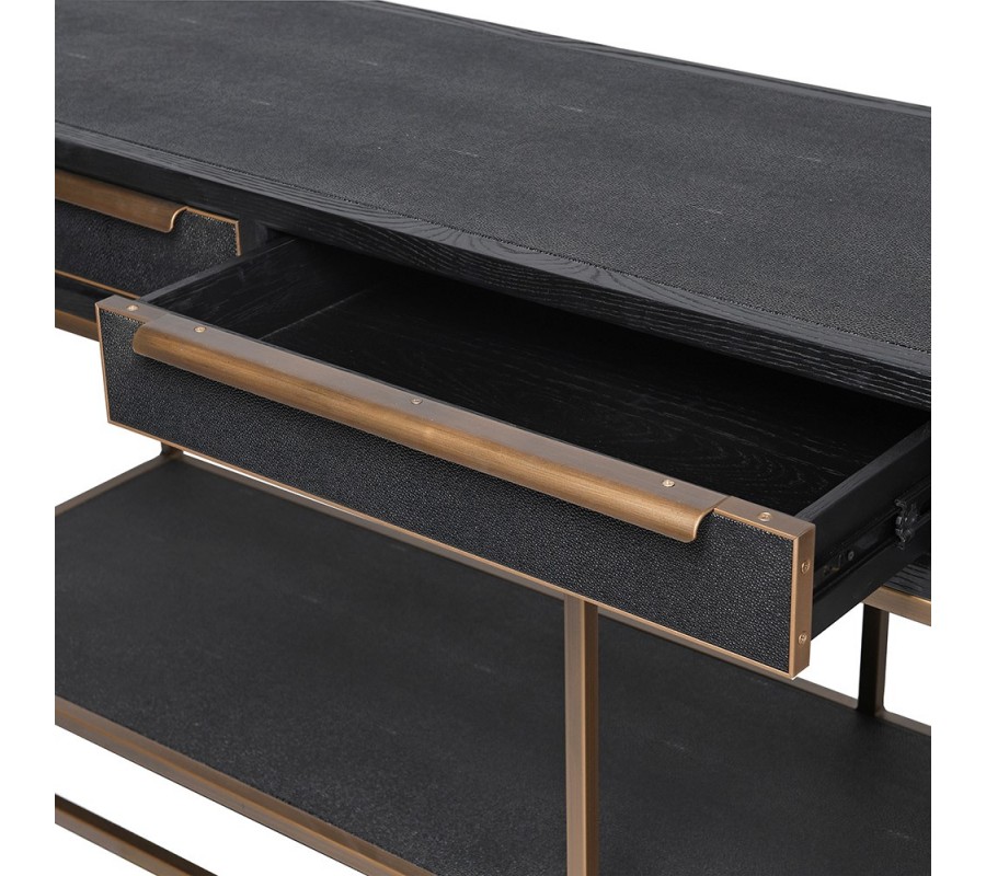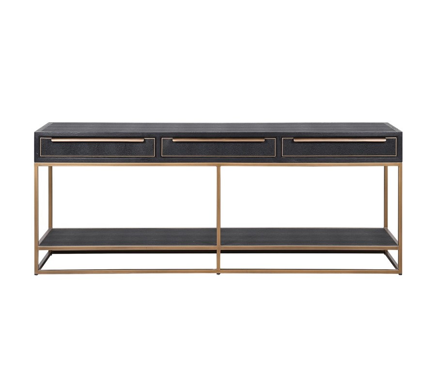 Luxusný art deco čierno-zlatý konzolový stolík Millie s tromi zásuvkami s reliéfom kože a veľkou policou 200 cm
