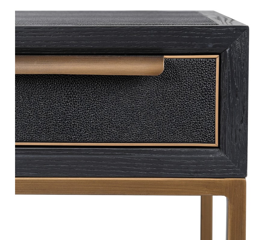 Vrchná časť a polica sú vyrobené z kvalitného orechového dreva s elegantným čiernym lakovaním, ktoré vizuálne zjednocuje jeho prírodnú štruktúru s koženým reliéfom. Zlaté prevedenie kovových častí prináša do dizajnu luxusný nádych. Kontrastné farby a geometrické tvary podčiarkujú inšpiráciu estetikou art deco štýlu a pomôžu vám priniesť do priestoru honosnú eleganciu 20. rokov minulého storočia.