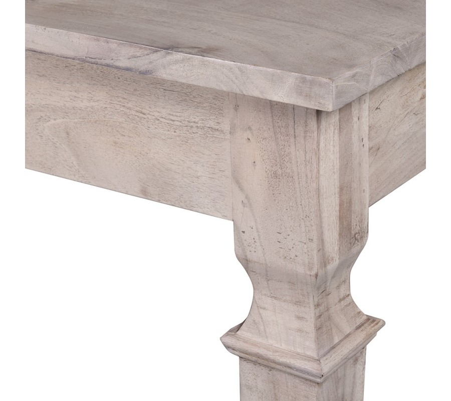 Obdĺžnikový stolík je vyrobený z kvalitného akáciového dreva v béžovej farbe s s patinou čo dodáva stolíku opotrebovaný vzhľad, ktorý je typickým znakom nábytku vo vintage štýle. Disponuje jednou väčšou doskou, ktorá ma robustný vzhľad a jednou menšou policou čo stolíku poskytuje viac úložného priestoru. Vrchná polica má malé vyrezávané nožičky, ktoré sú pripevnené o strednú dosku stola.