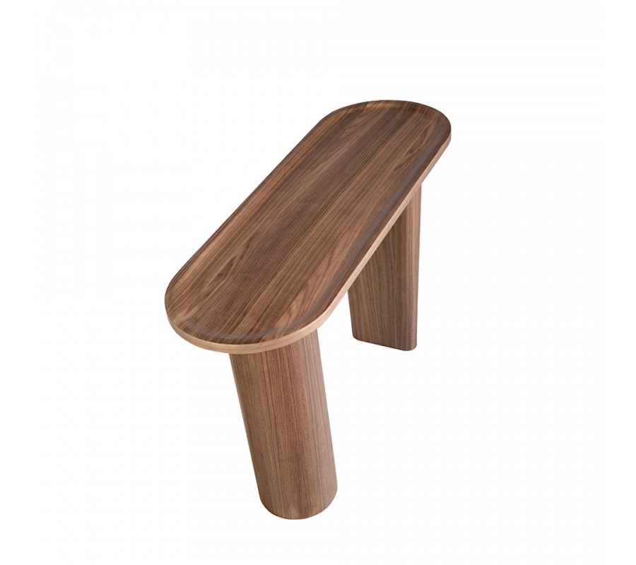 Vrchná doska je oválna. Smerom k okrajom v jemnej krivke stúpa, čo vytvára praktické vyvýšené ohraničenie odkladacej plochy. Je položená na dvoch dlhých nožičkách. Jedna nožička má klasický mohutný valcovitý tvar. Druhá má oválny pôdorys, je plochá smerom dole sa zužuje. Odlišný dizajn vytvára v rámci minimalistického štýlu nápaditý asymetrický dekoratívny element.