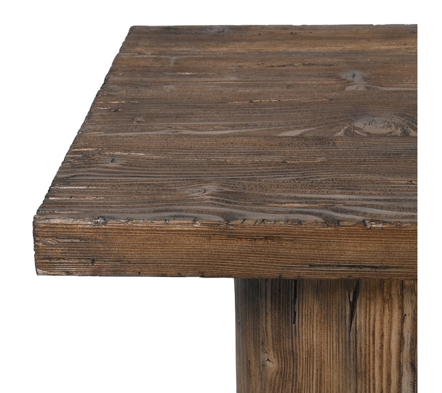 Rovné povrchy oživuje výrazná štruktúra dreva. Kresba letokruhov strieda tmavšie a svetlejšie odtiene hnedej a zároveň ju zvýrazňuje aj autentický nerovný povrch dreva. Nábytok tak získava vizuálnu hĺbku, ktorá prinesie do priestoru naturálny element a zároveň výborne korešponduje so zámerne zostarnutým vzhľadom dreva.