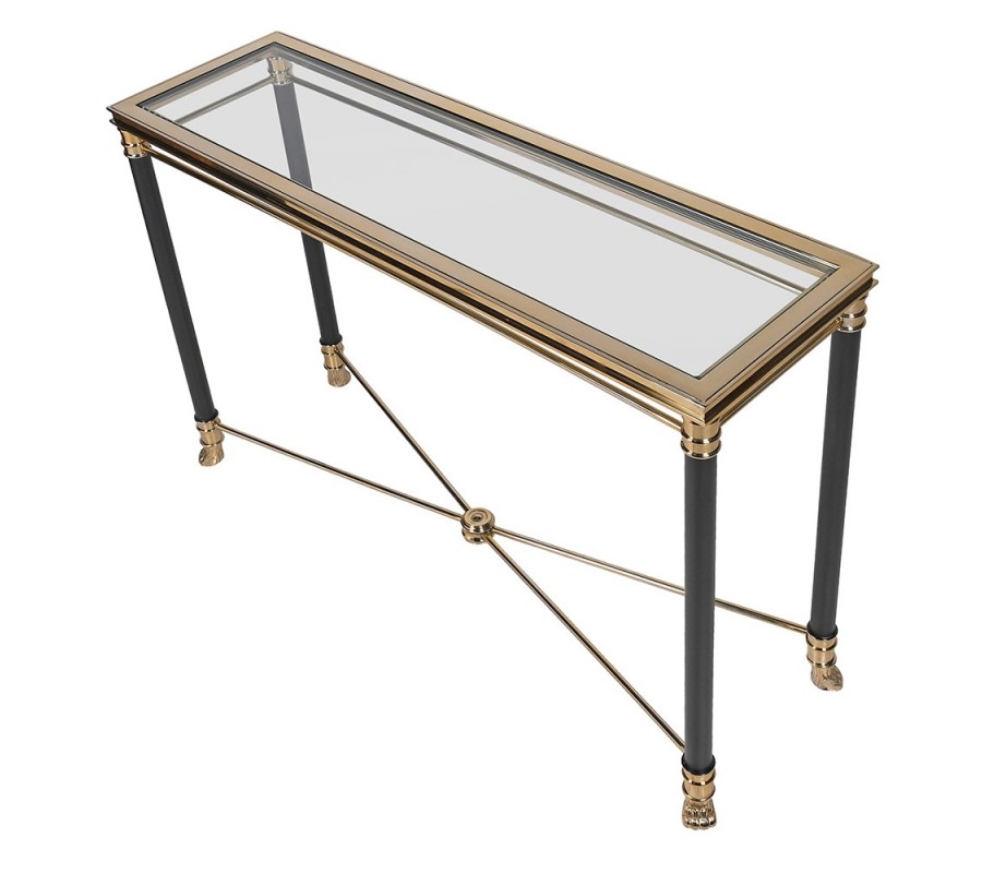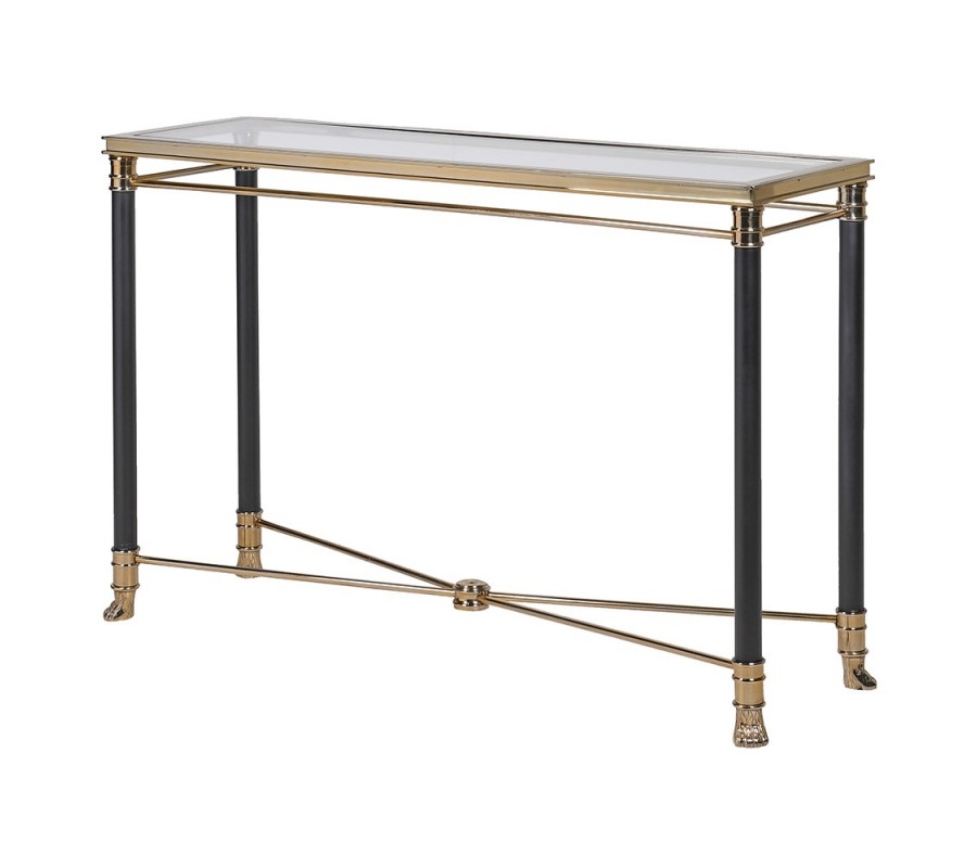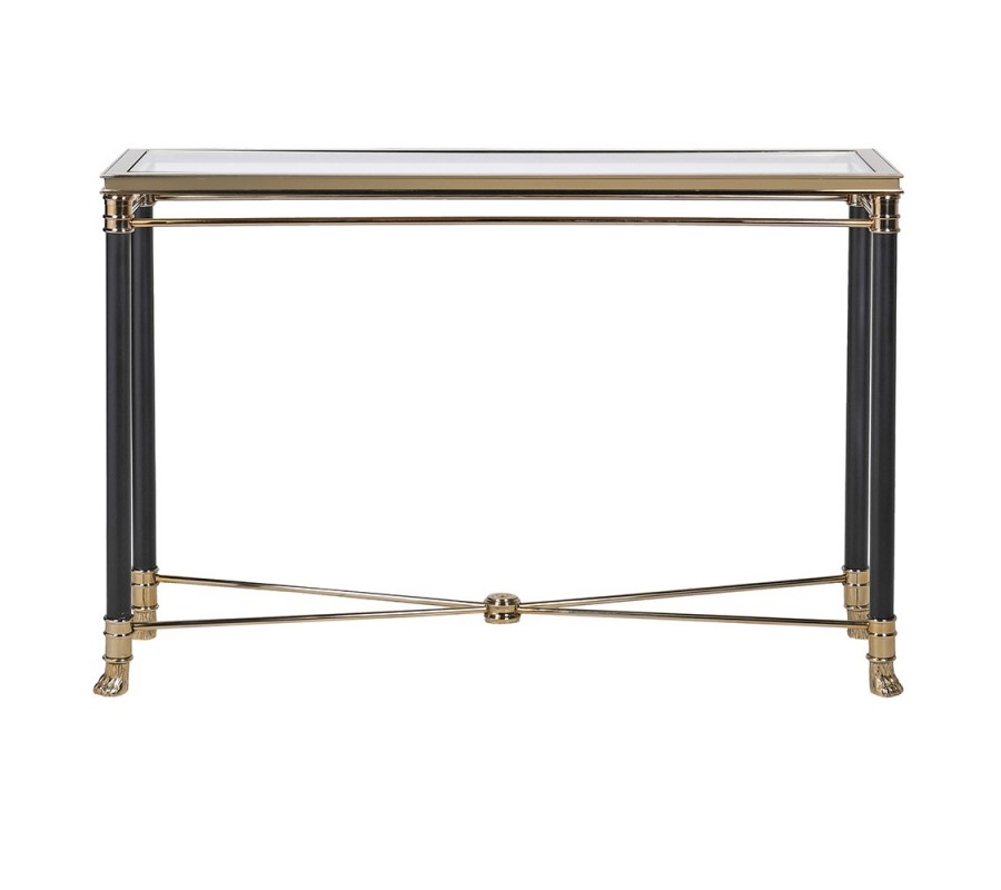 Luxusný glamour sklenený konzolový stolík Lion s nohami ukončenými levími labami v čiernej a zlatej farbe 121 cm