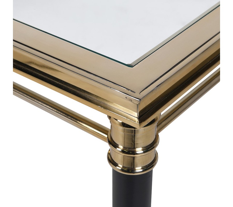 Sofistikovaná farebná kombinácia čiernej a zlatej pôsobí elegantným dojmom a spojenie rovných línií s okrúhlymi prvkami vytvára premyslený a vyvážený vizuál. Obdĺžniková vrchná doska je vyrobená z priehľadného bezpečnostného skla a poskytuje pevný a odolný povrch. Je umiestnená vo vyššom kovovom ráme v lesklej zlatej farbe. Jeho bočná strana má zvýraznené predĺžené okraje, ktoré sa vizuálne prepájajú s obdĺžnikovou spojnicou nožičiek, umiestnenou pod vrchnou doskou. Vytvárajú dekoračný geometrický prvok, typický pre art deco štýl. Rám aj spojnica sú pripevnené k valcovitým vrchným ukončeniam nožičiek v rovnakej zlatej farbe.