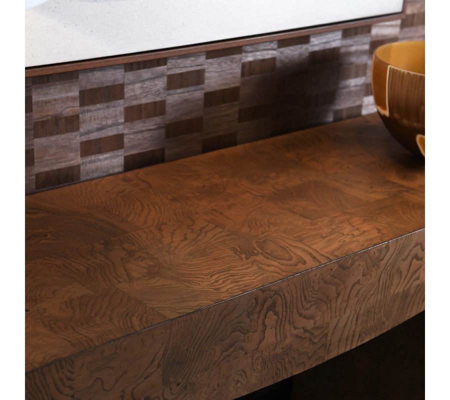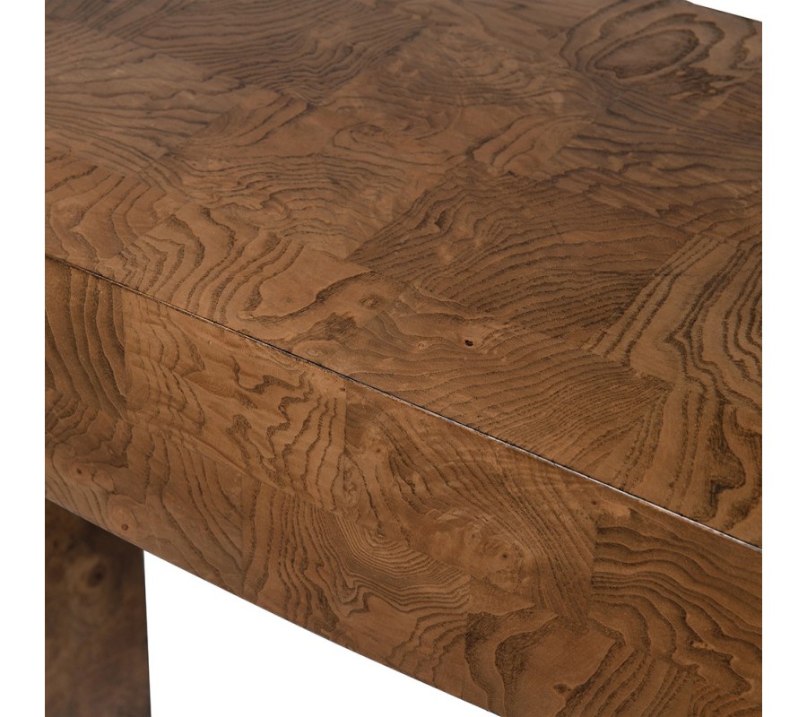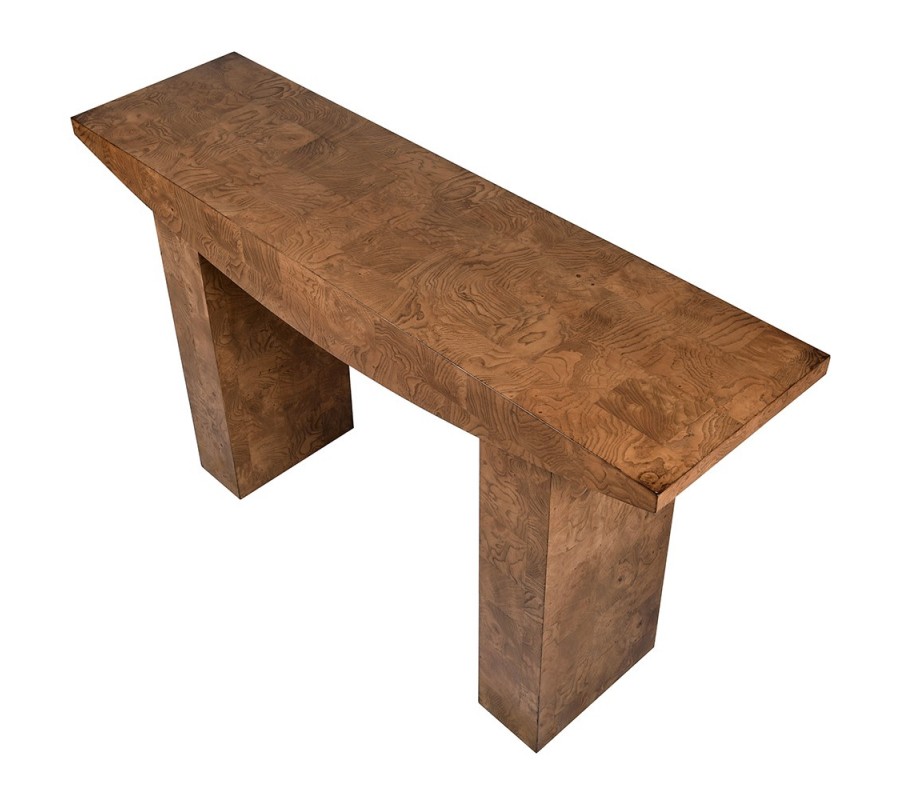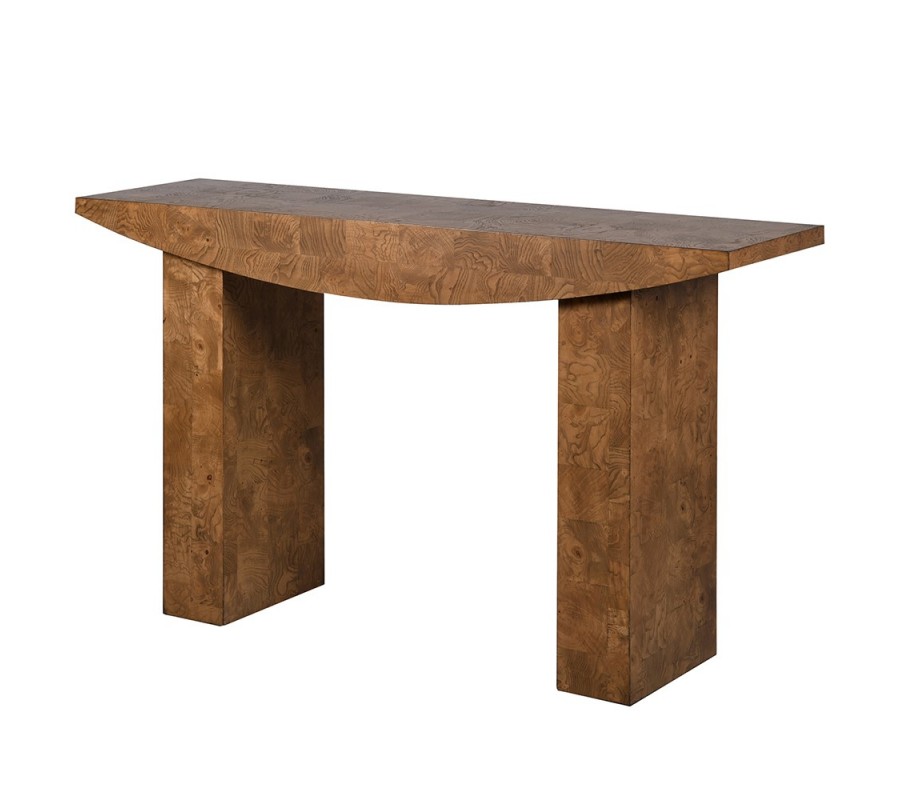 Luxusný moderný konzolový stolík Ajaxio v prírodnej hnedej farbe z dreva burl s asymetrickou štruktúrou 145 cm
