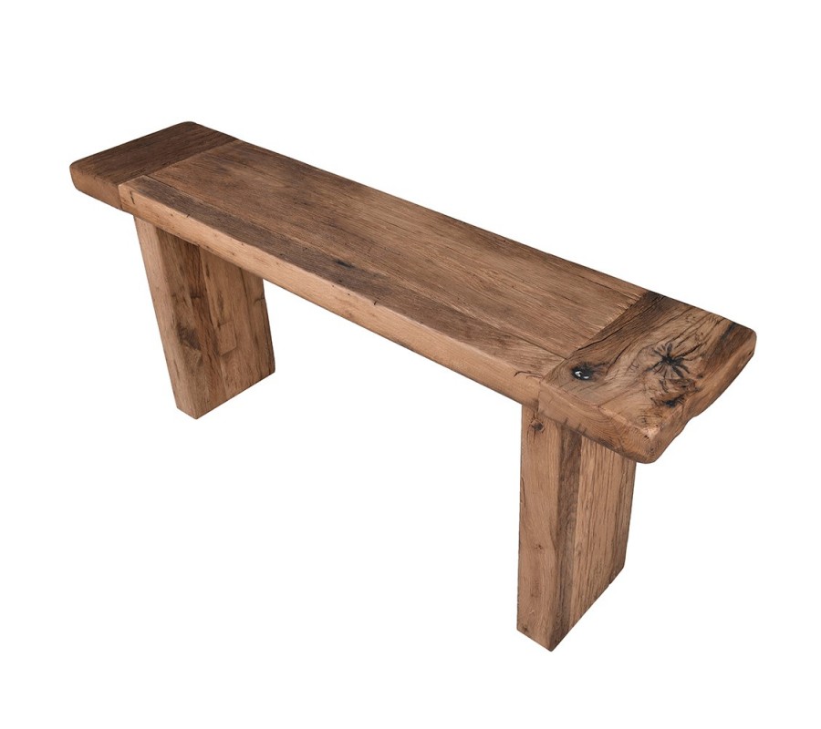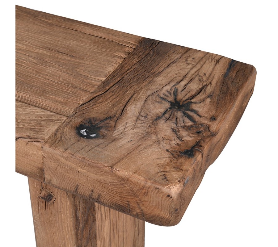 Stolík je vyrobený z recyklovaného dubového dreva, ktoré dodáva každému kusu jedinečný vintage vizuál. Má elegantnú svetlú hnedú farbu s výraznou štruktúrou a tmavšou kresbou letokruhov, ktorá dodáva nábytku organický charakter. Použitie recyklovaného dreva je zároveň šetrné k životnému prostrediu.